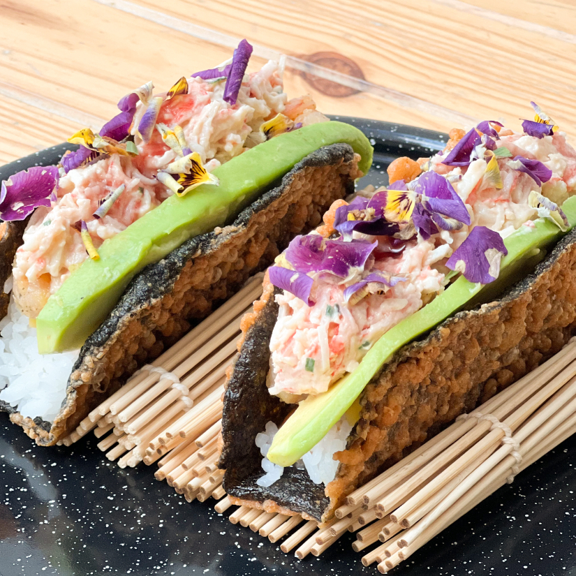 Tacos de sushi con camarones salteados o atún encostrado, kanikama, pico de gallo de piña, crema de jengibre, aguacate, salsa ponzu y de ajonjolí.
