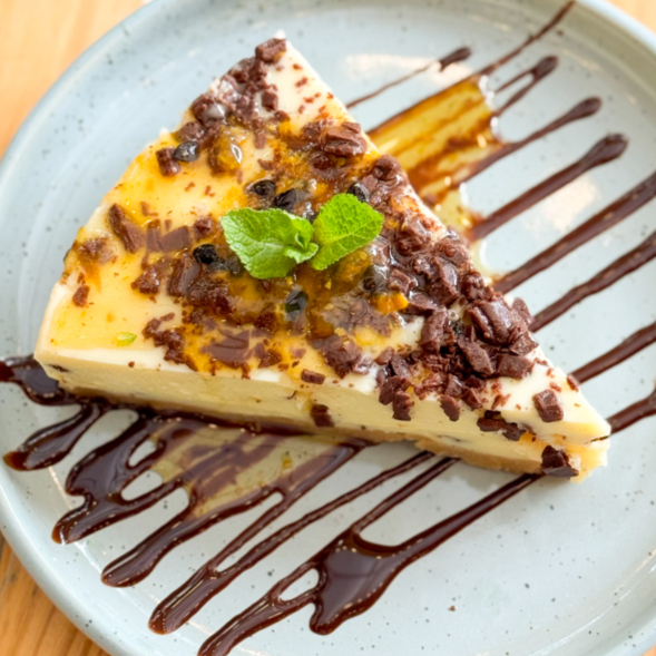 Con sutiles toques de chocolate semiamargo y base crunch de galleta de chocolate, bañado con salsa de maracuyá y mango.