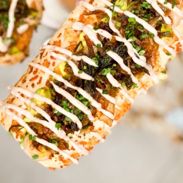 Burrito de sushi con camarones crunch, tocineta carameliza en frutos amarillos, sour cream, pico de gallo de piña, aguacate, cebolla crunch y mayonesa de maracuyá.