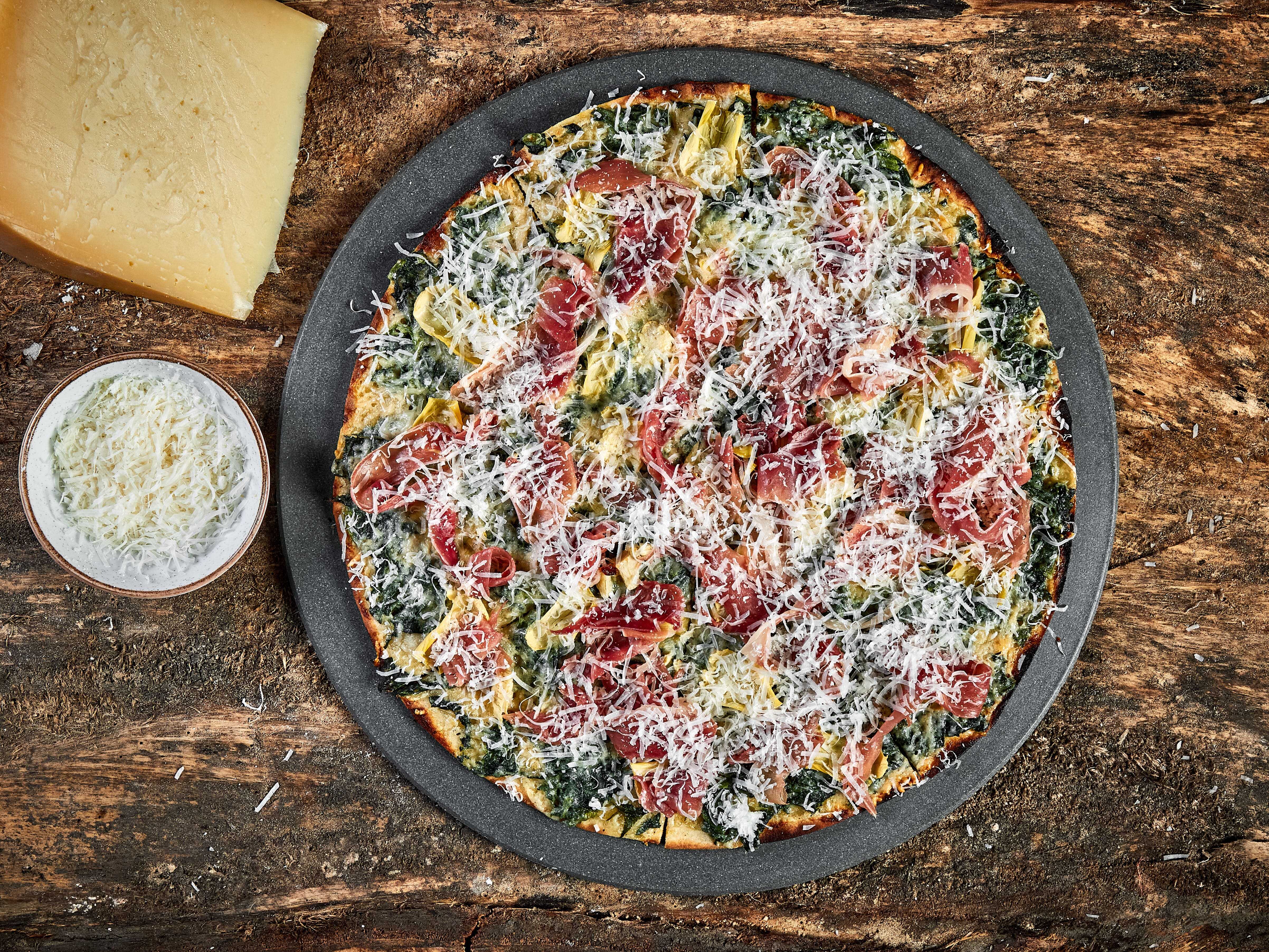 Delicioso mix de espinacas con aceite de trufas, jamón serrano, parmesano y alcachofas.