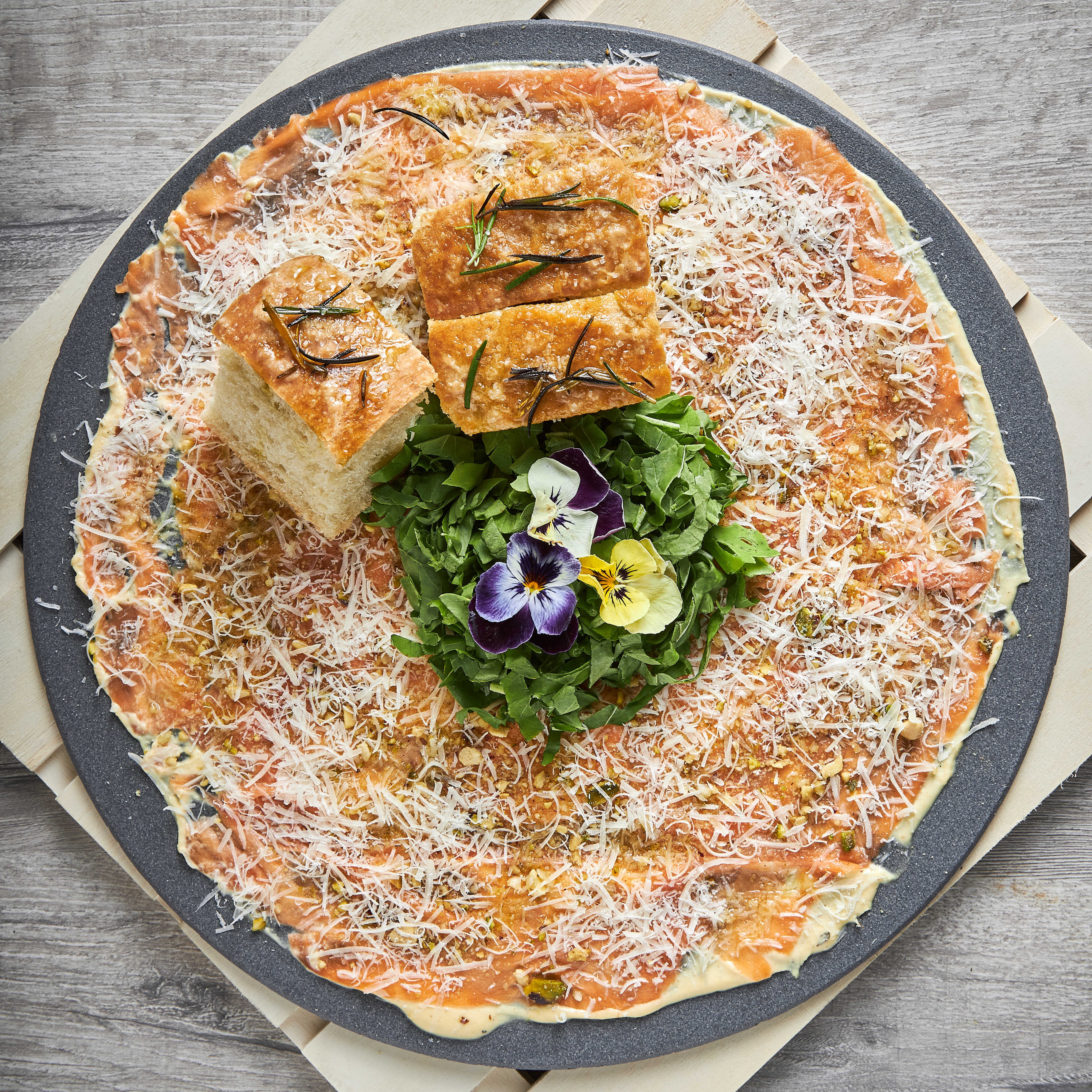 Nuestra masa crocante cubierta con mezclum y flores, base pomodoro, jamón serrano, salami, vinagreta mediterránea y reducción balsámica.