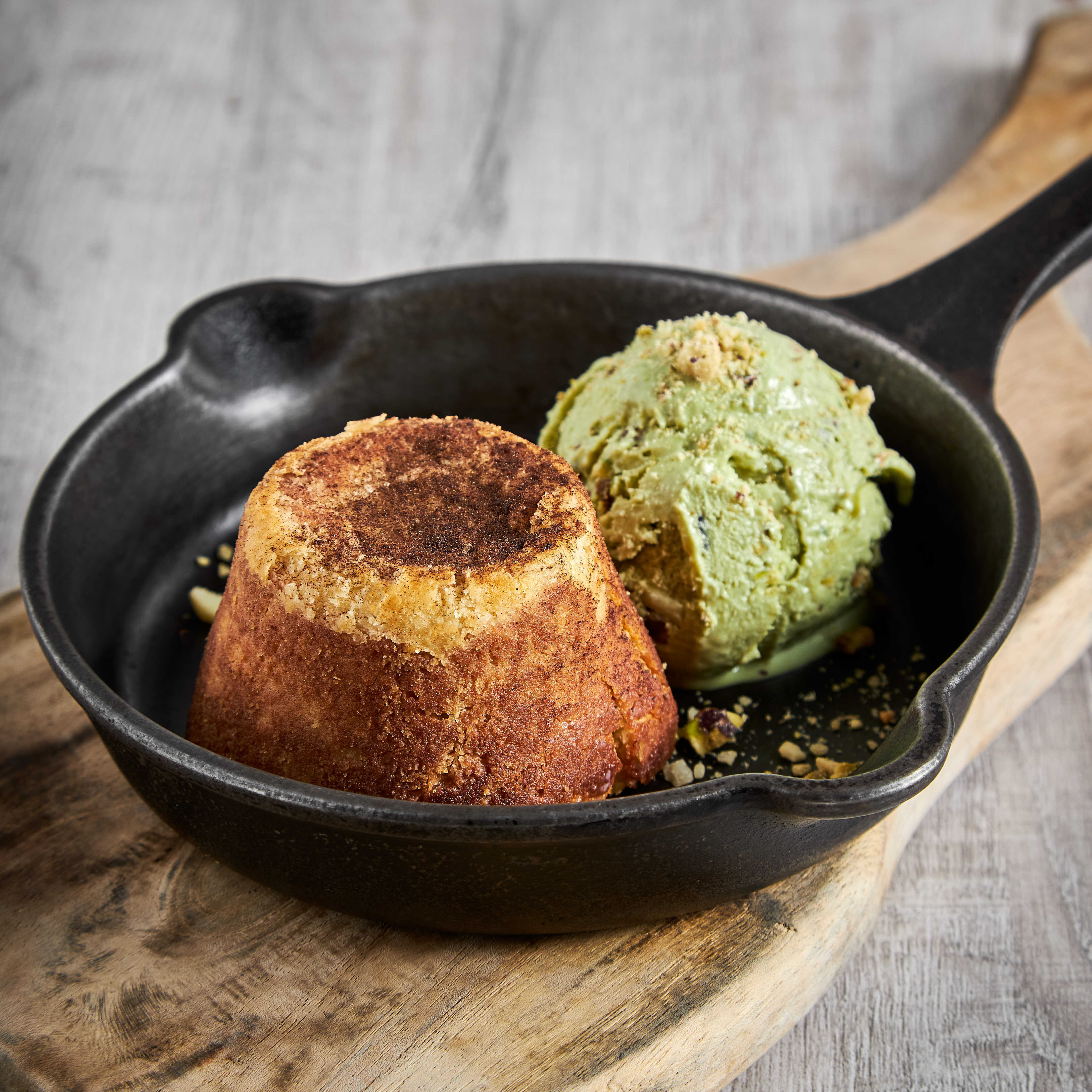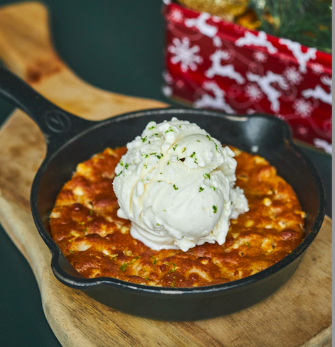 Deliciosa galleta de chocolate con macadamia y chocolate blanco, acompañada de gelato a elección y ralladura de limón.