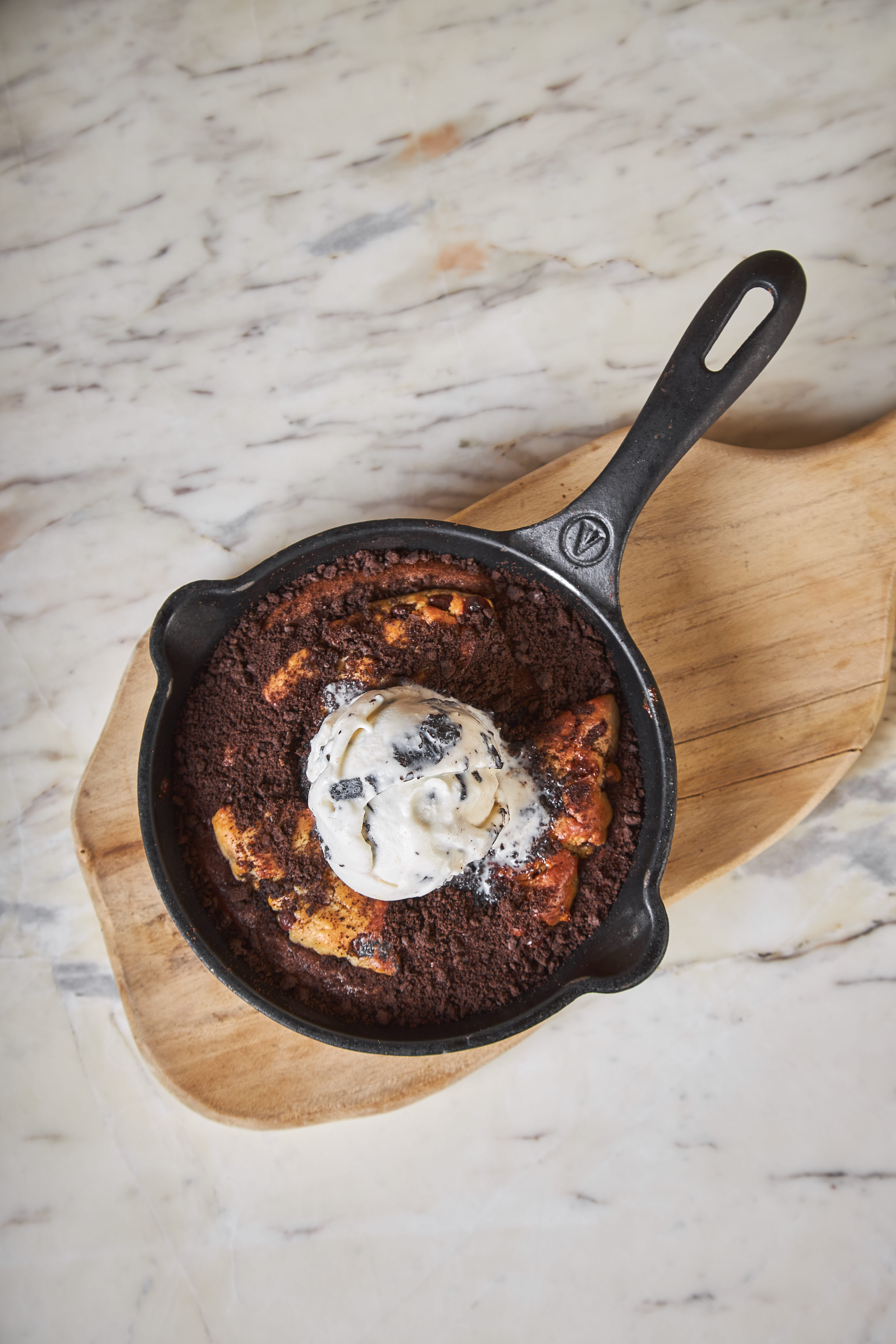 Delicioso brownie recién horneado con troncos de nuestra galleta crocante Oreo, acompañado de gelato a elección.