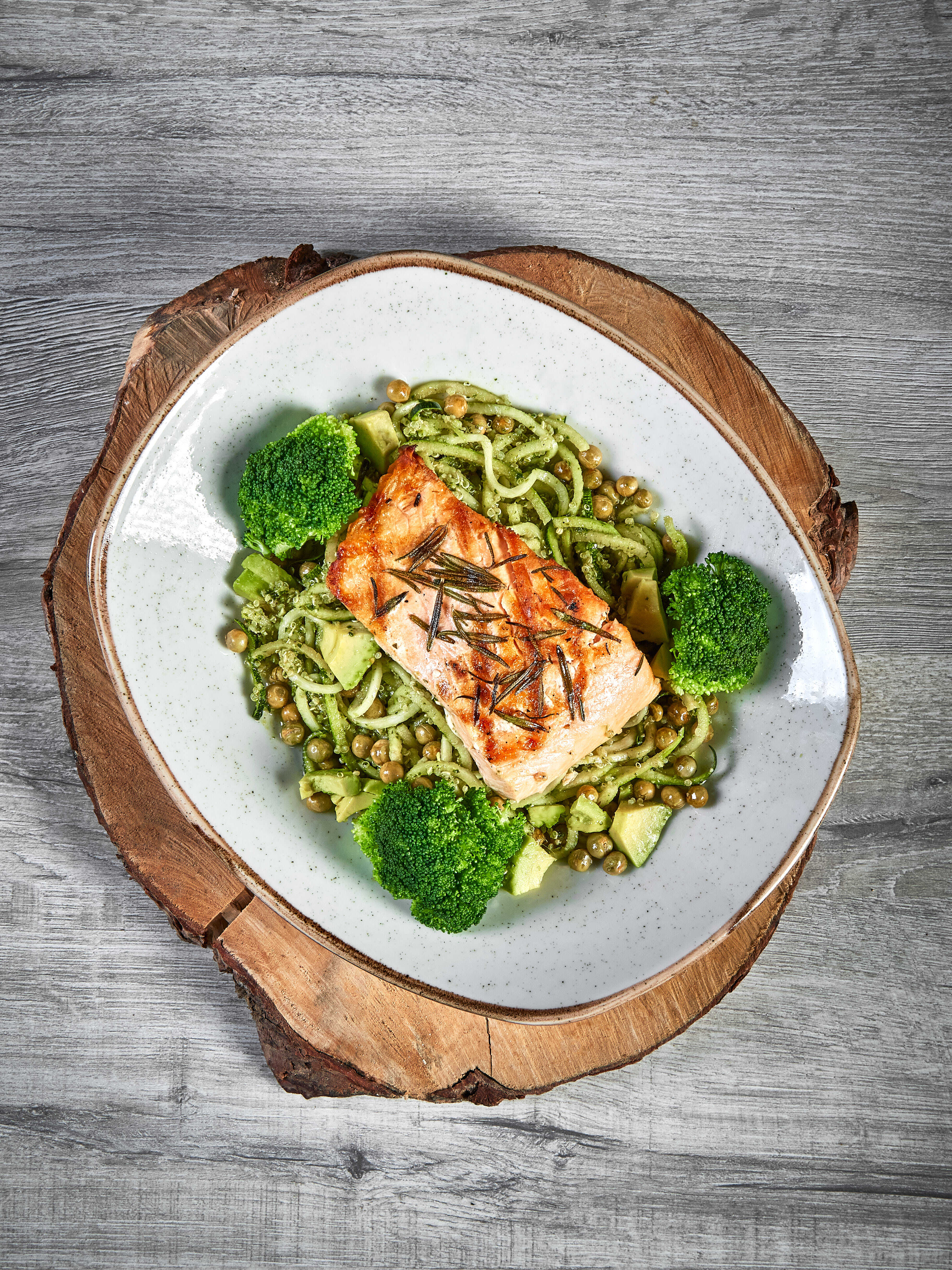 Fideos de zucchini y manzana verde, con quínoa, brócoli blanqueado, panela orgánica, arvejas crocantes, aguacate y pesto rústico. Proteína a elección. producto frío**.