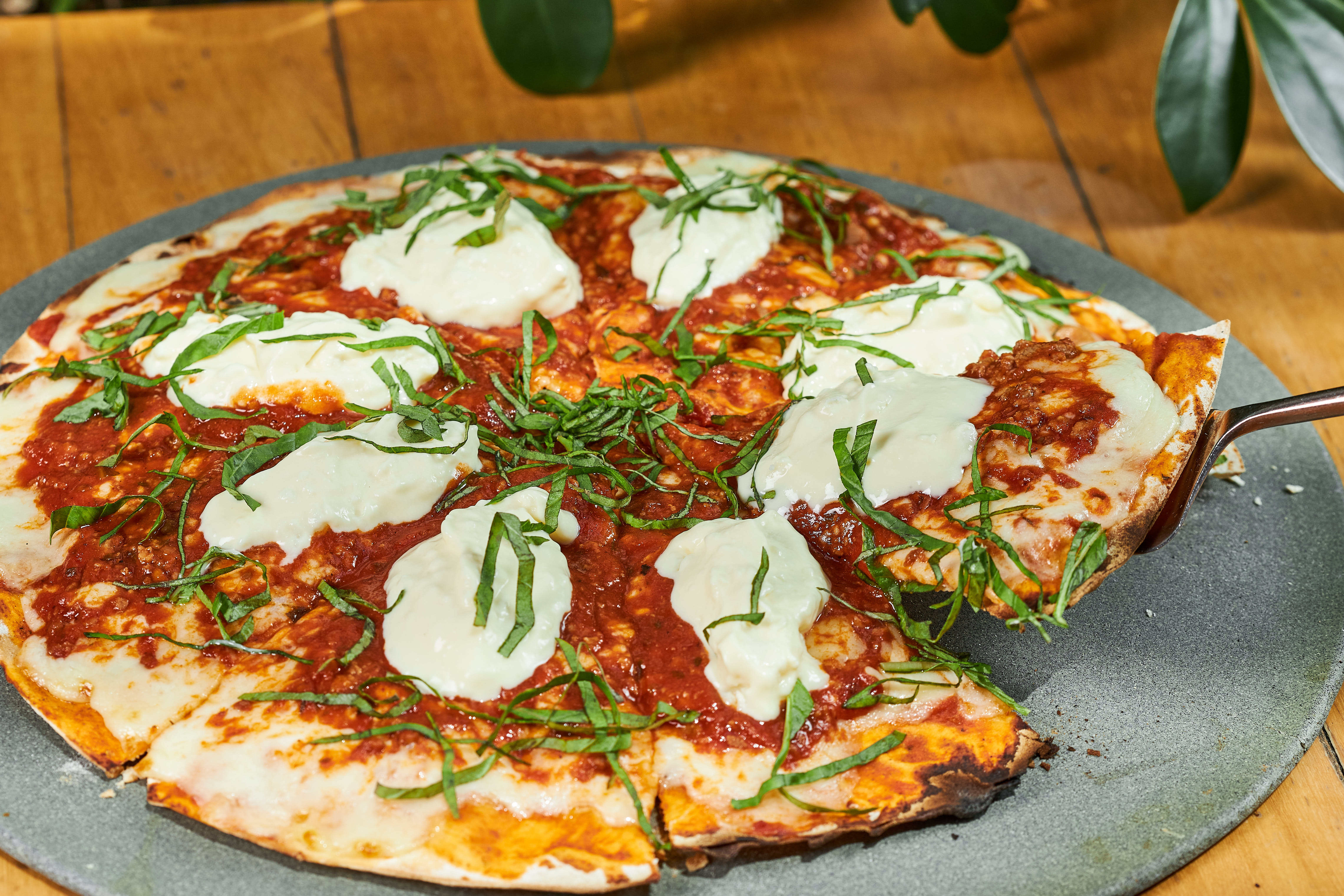Deliciosa combinación de salsa bolognesa con stracciatella y albahaca, en nuestra masa crocante.