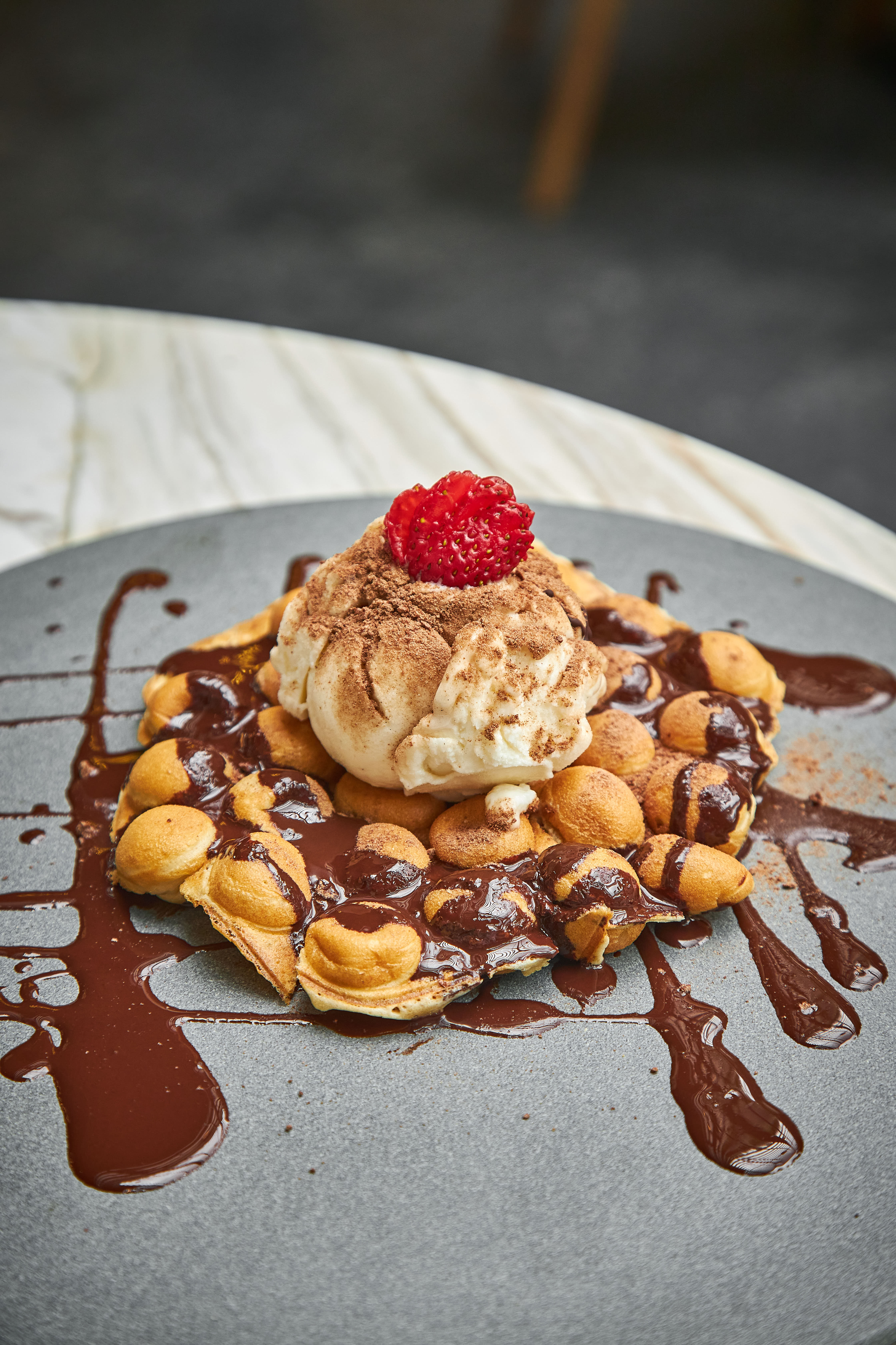 Deliciosa masa de galleta rellena de chocolate, acompañado de gelato a elección.