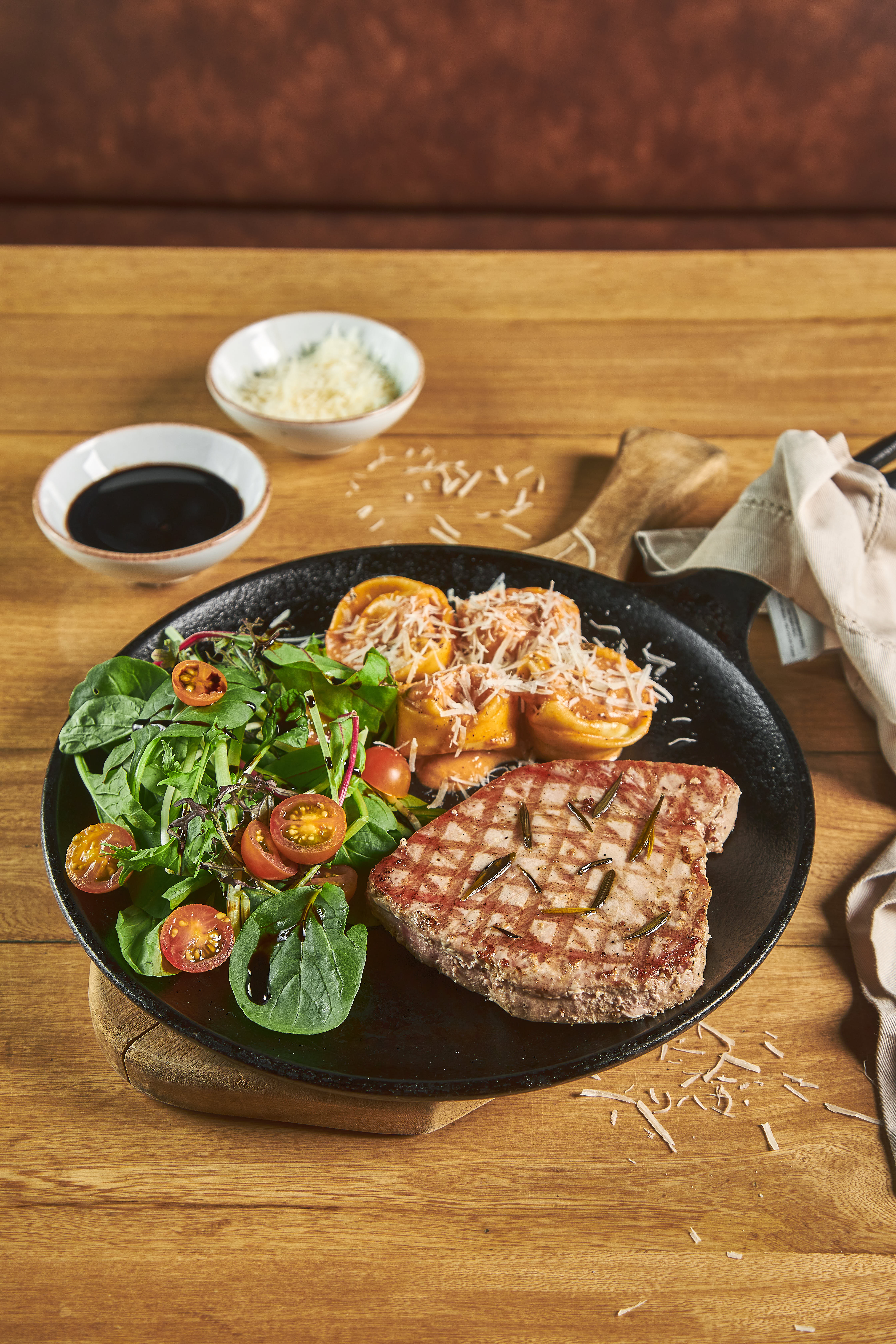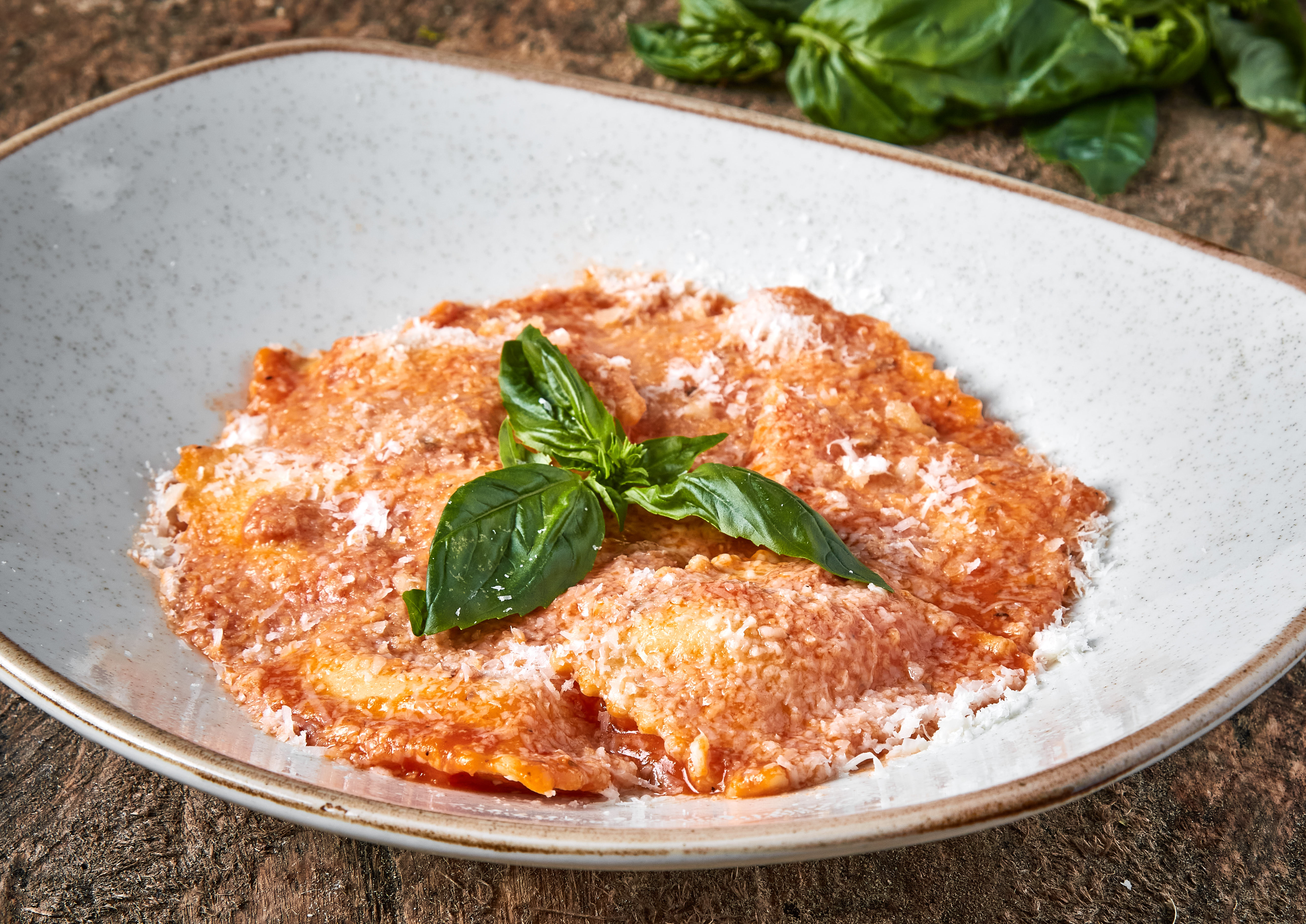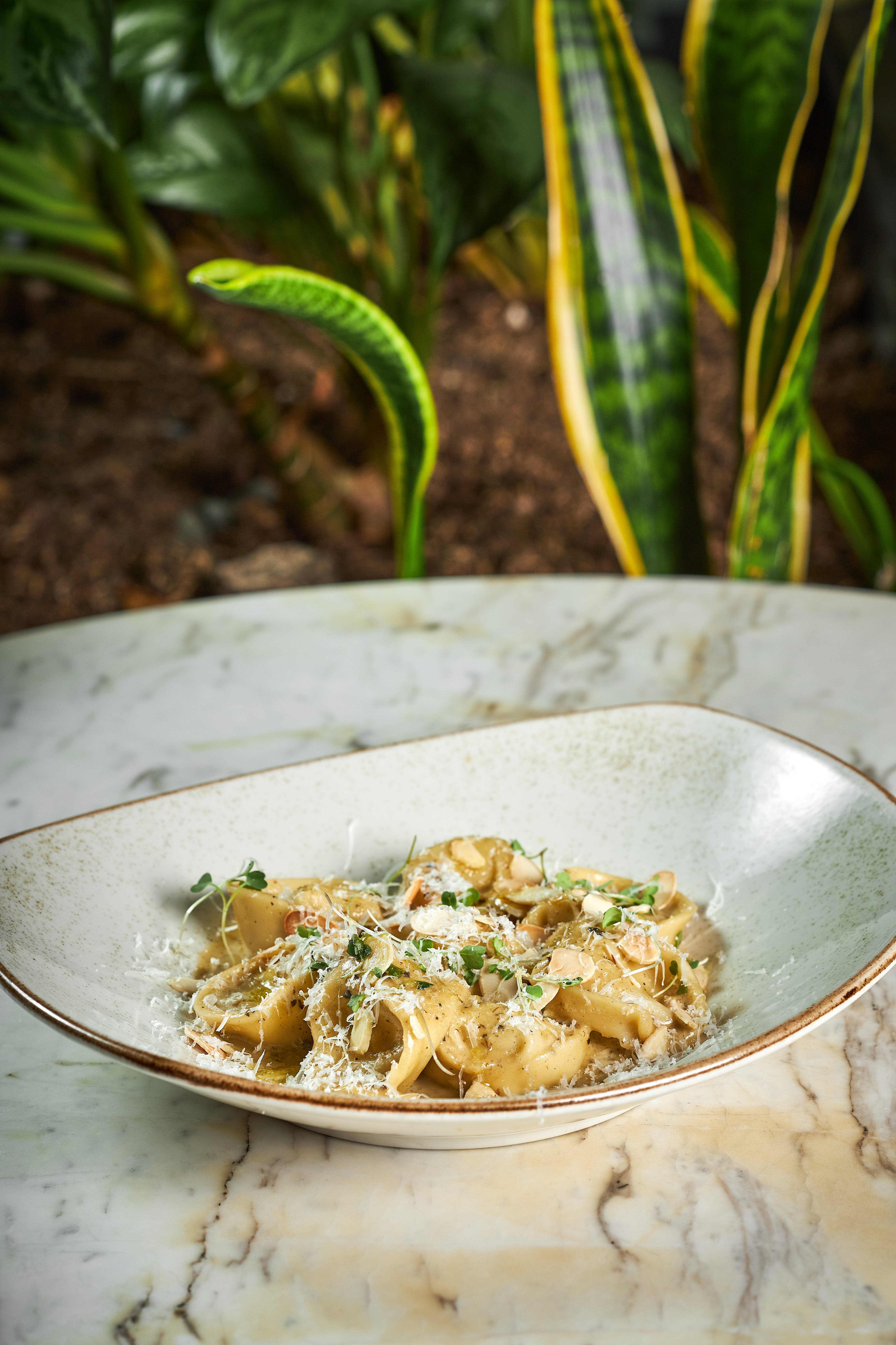 Pasta ripiena (a elegir) bañado en salsa trufada con almendras tostadas y brotes de rúgula. Acompañadas de nuestro tradicional pan focaccia.