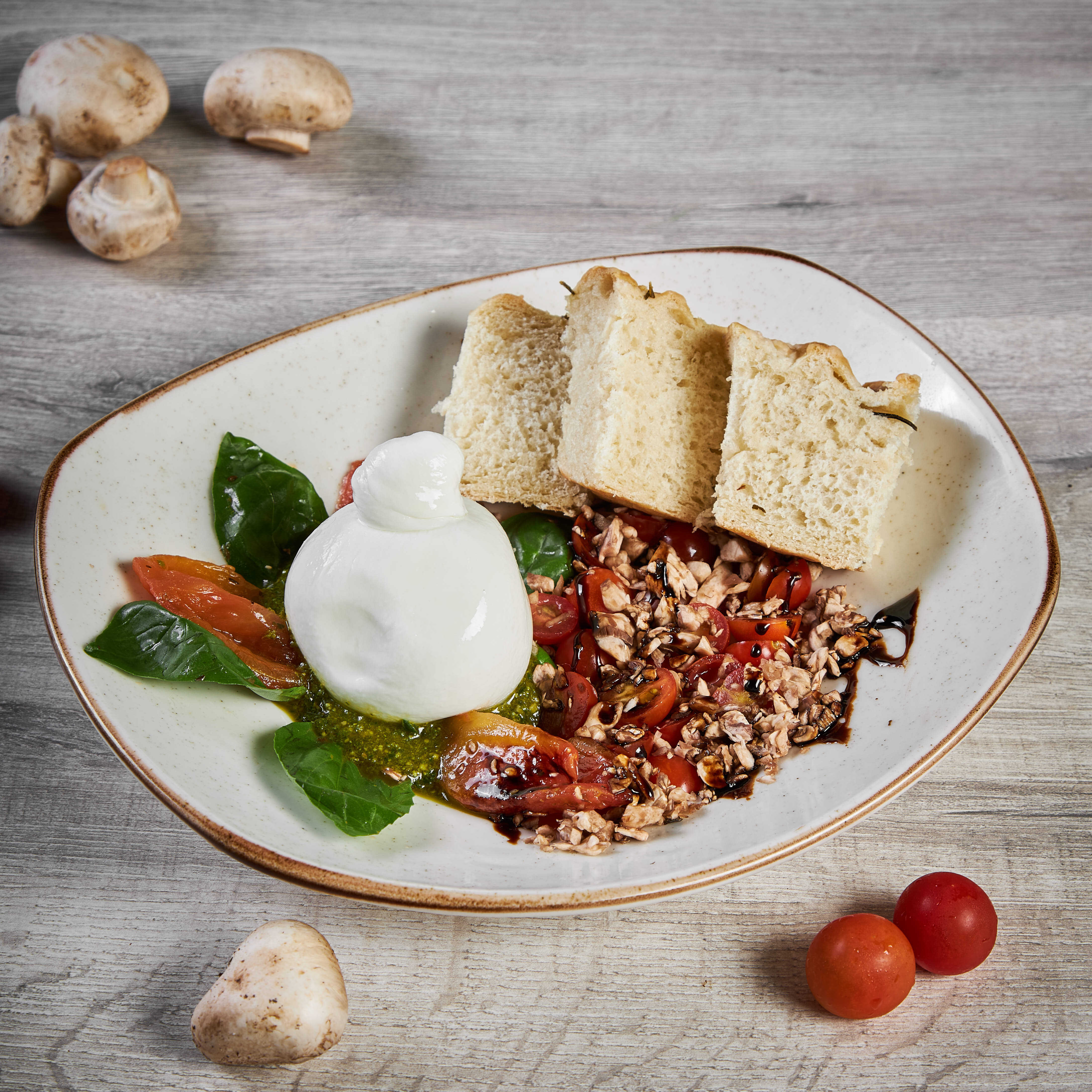 Mozzarella de búfala rellena de crema, cubierta con jamón serrano, reducción balsámica, tomates confitados, pesto rústico y mezclum, acompañada de pan focaccia.
