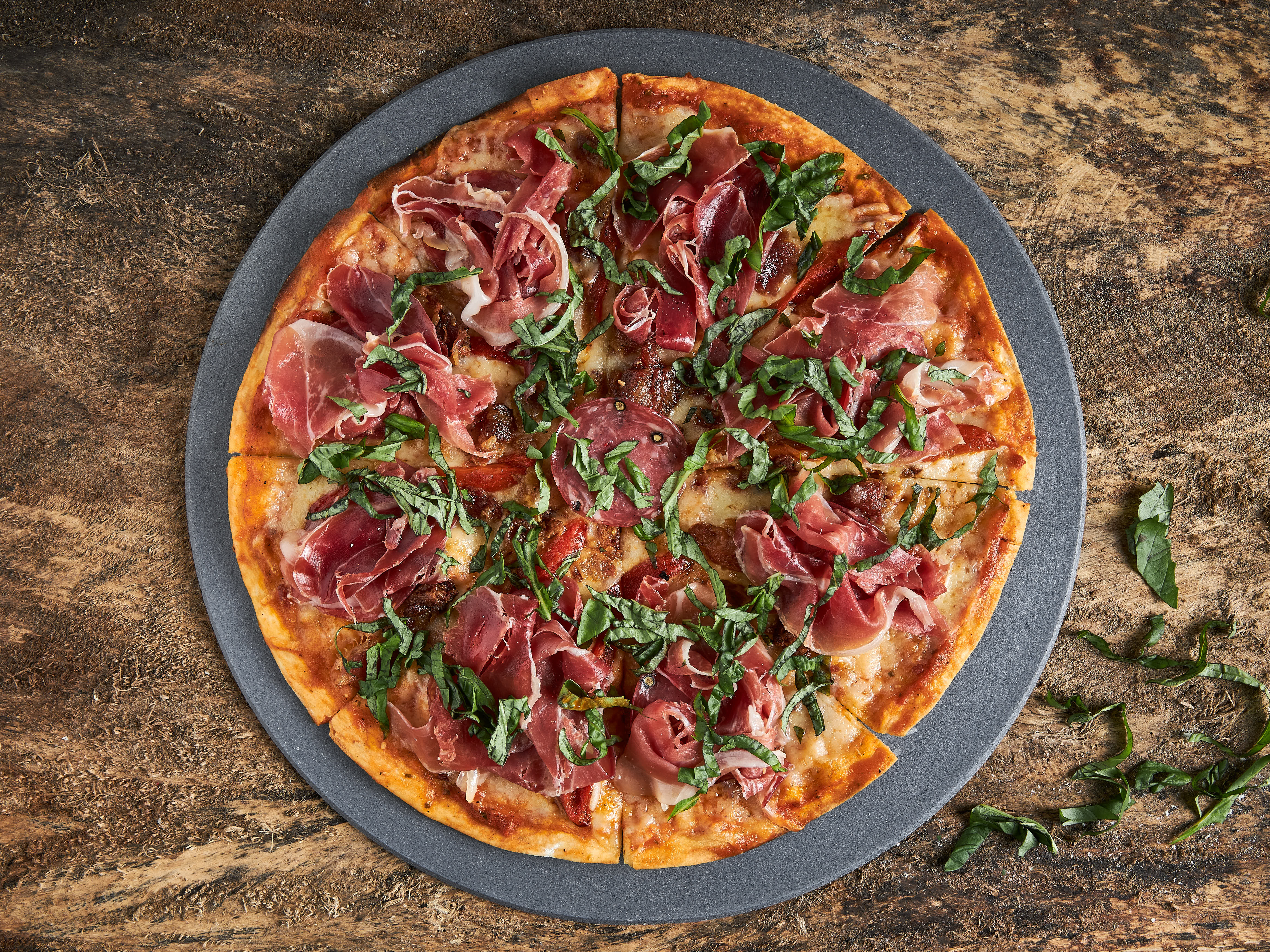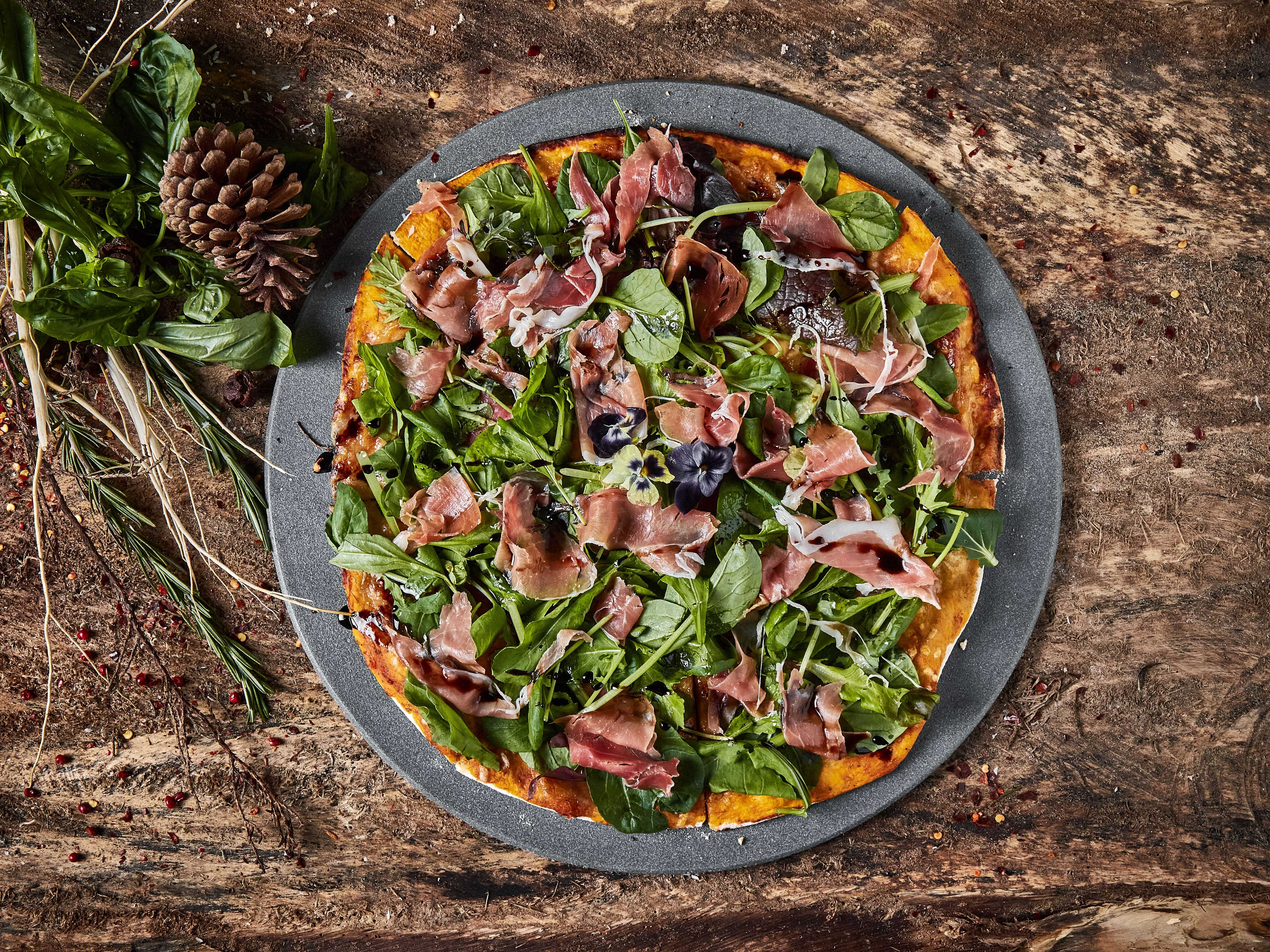 Nuestra masa crocante cubierta con mezclum y flores, base pomodoro, jamón serrano, salami, vinagreta mediterránea y reducción balsámica.