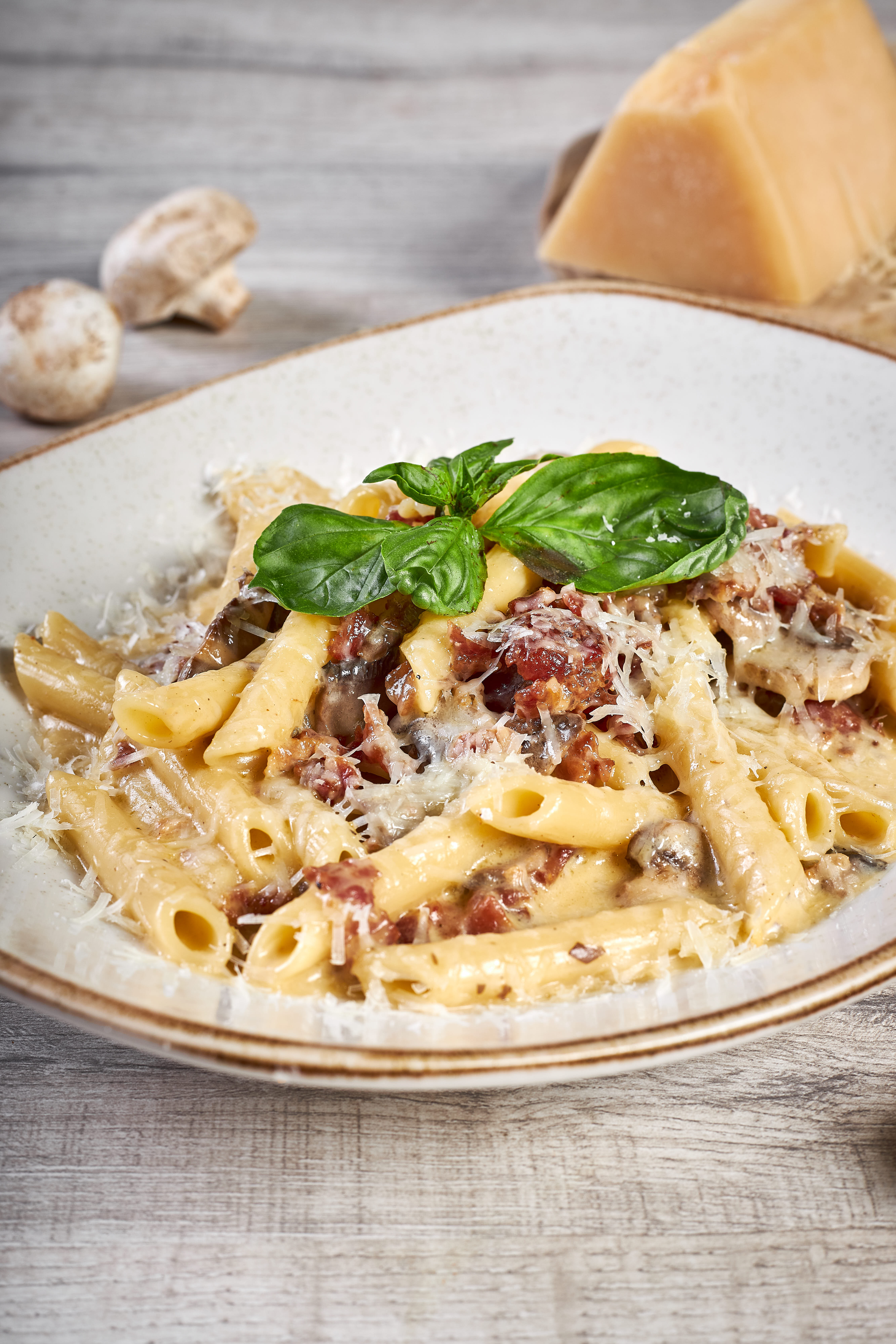 Pasta con tocineta, acompañada de champiñones en crema blanca terminada con parmesano y albahaca (pasta a elección penne o fetuccini).
