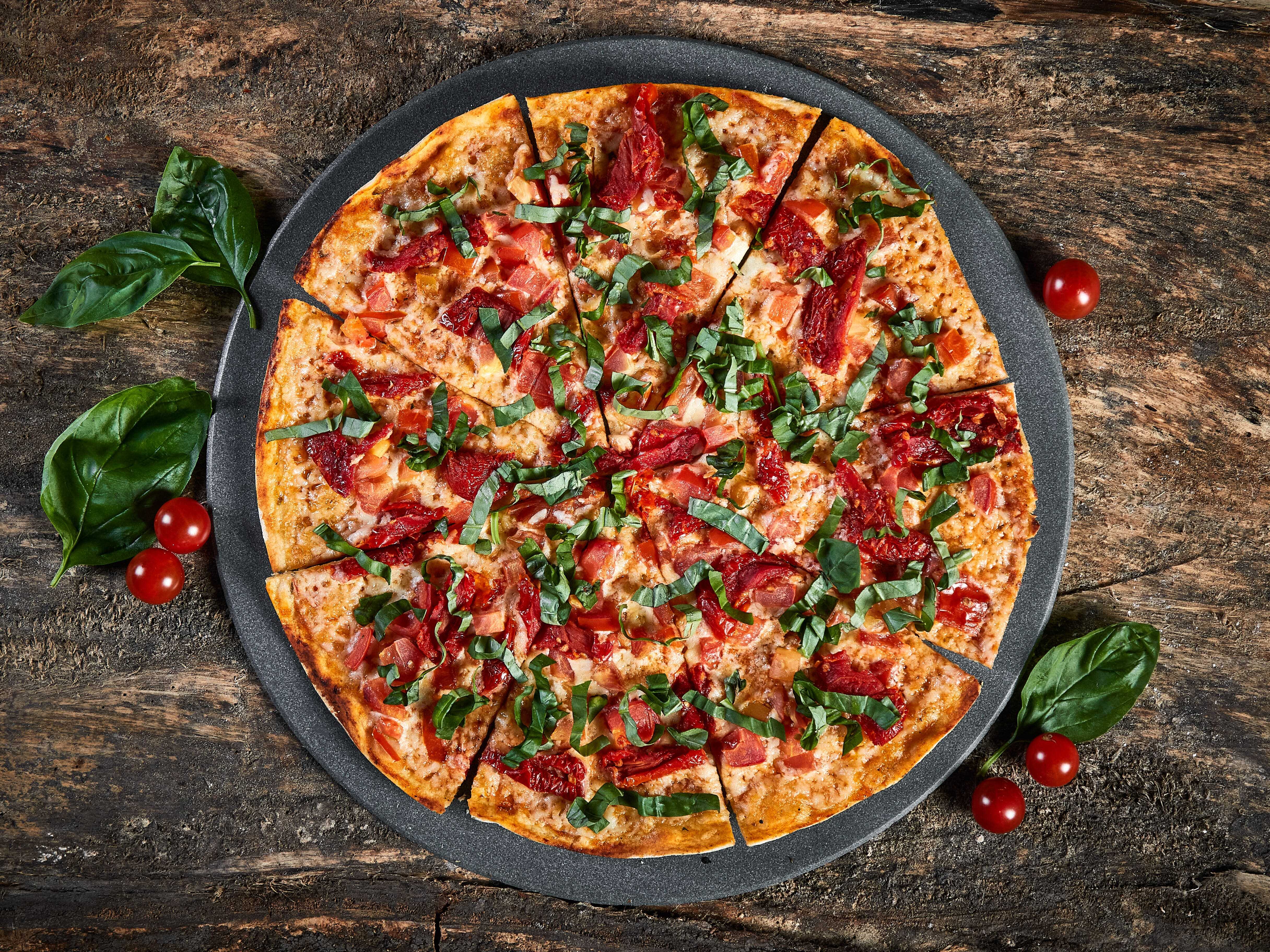 Nuestra tradicional base pomodoro o pesto rústico, acompañada de tomates secos y frescos, albahaca y queso mozzarella.