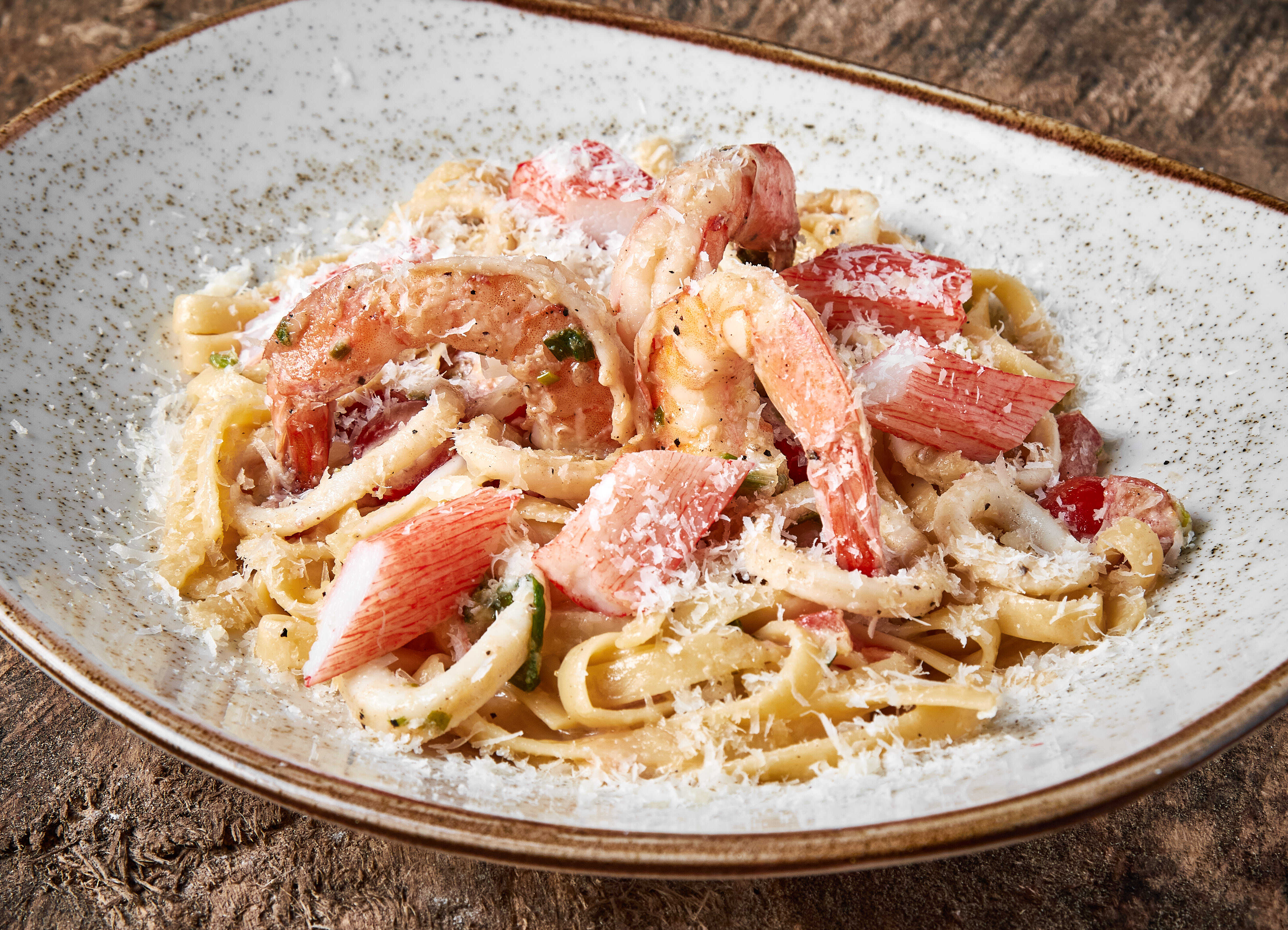 Pasta con langostino, camarones, calamares, palmitos, queso parmesano, tomate cherry, cebolla junca, salsa blanca y un ligero toque de ajo (pasta a elección penne o fetuccini).