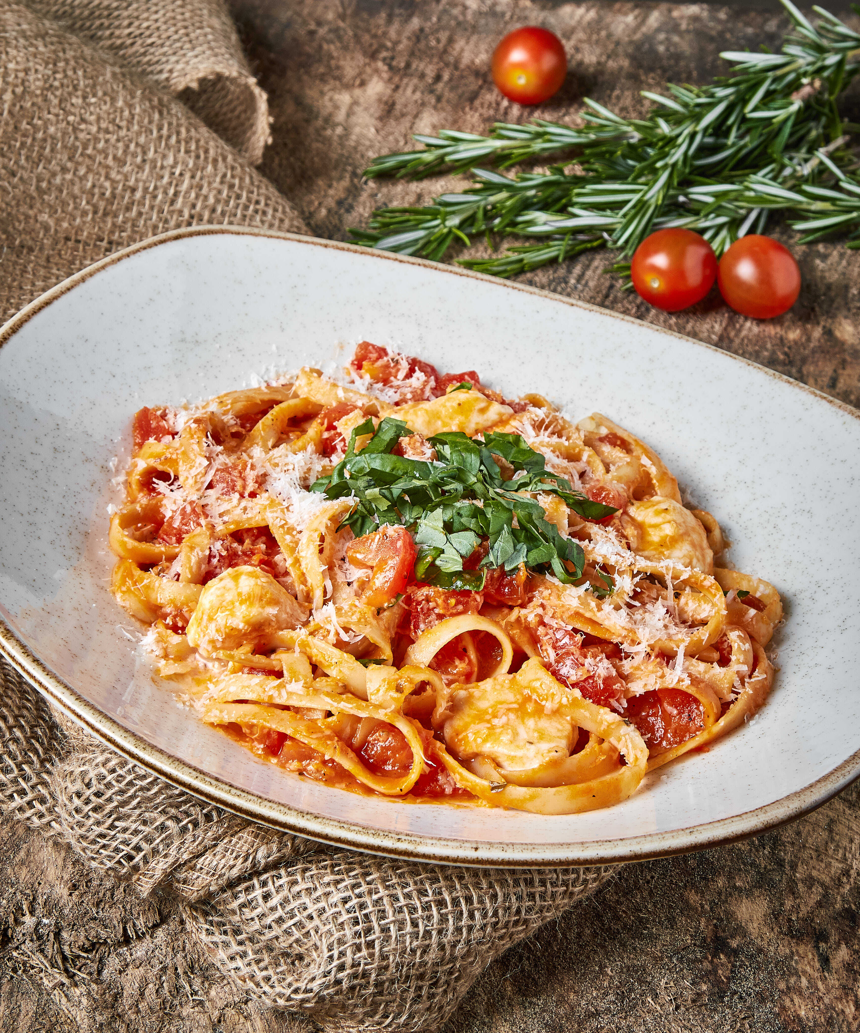 Pasta en salsa pomodoro, boconccino, albahaca y trozos de tomate fresco (pasta a elección penne o fetuccini).