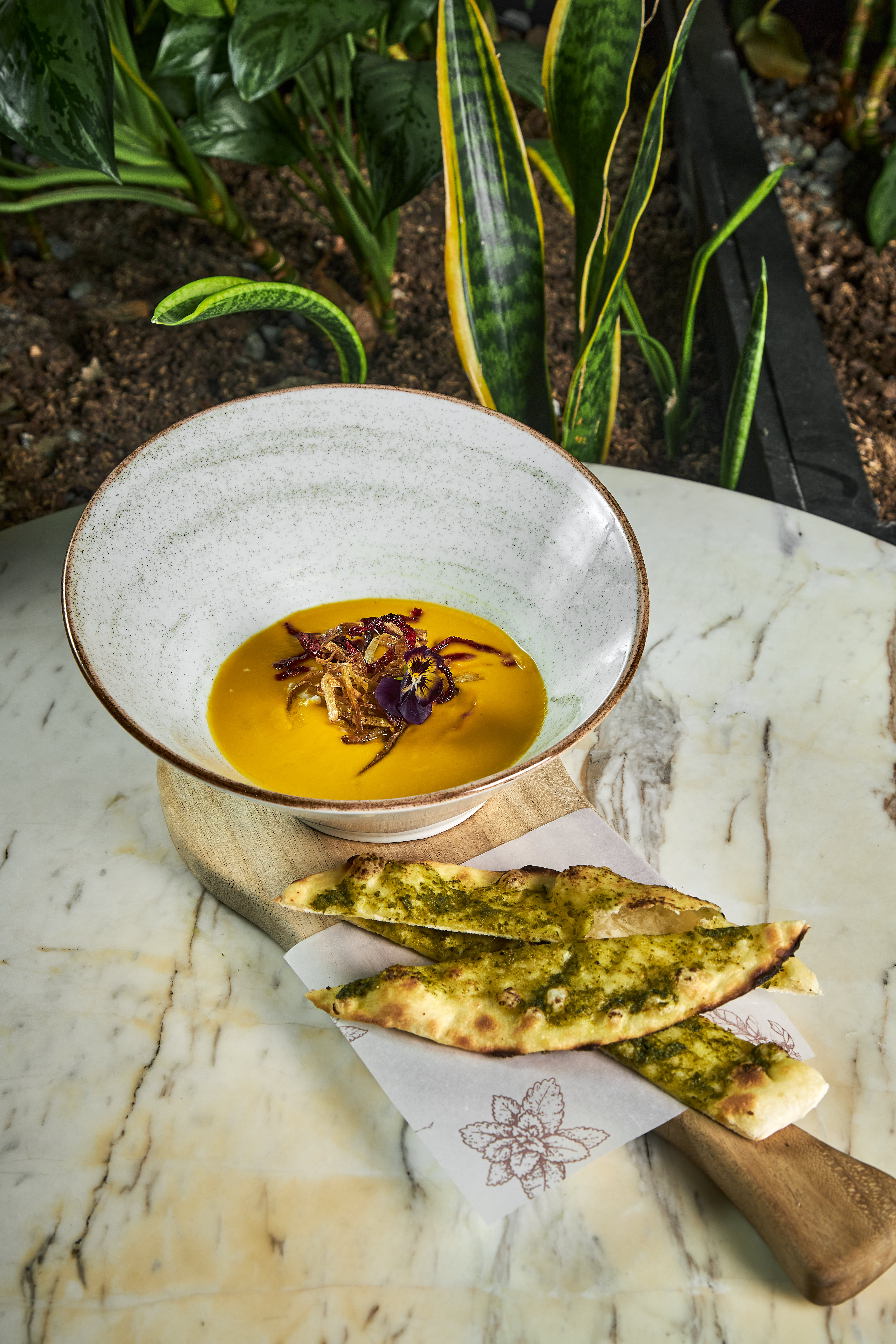 Deliciosa preparación cremosa a base de zanahoria y cúrcuma, finalizado con queso feta, cipolla y remolacha crocante. Acompañado de bastones de masa de pizza fresca con pesto rústico.