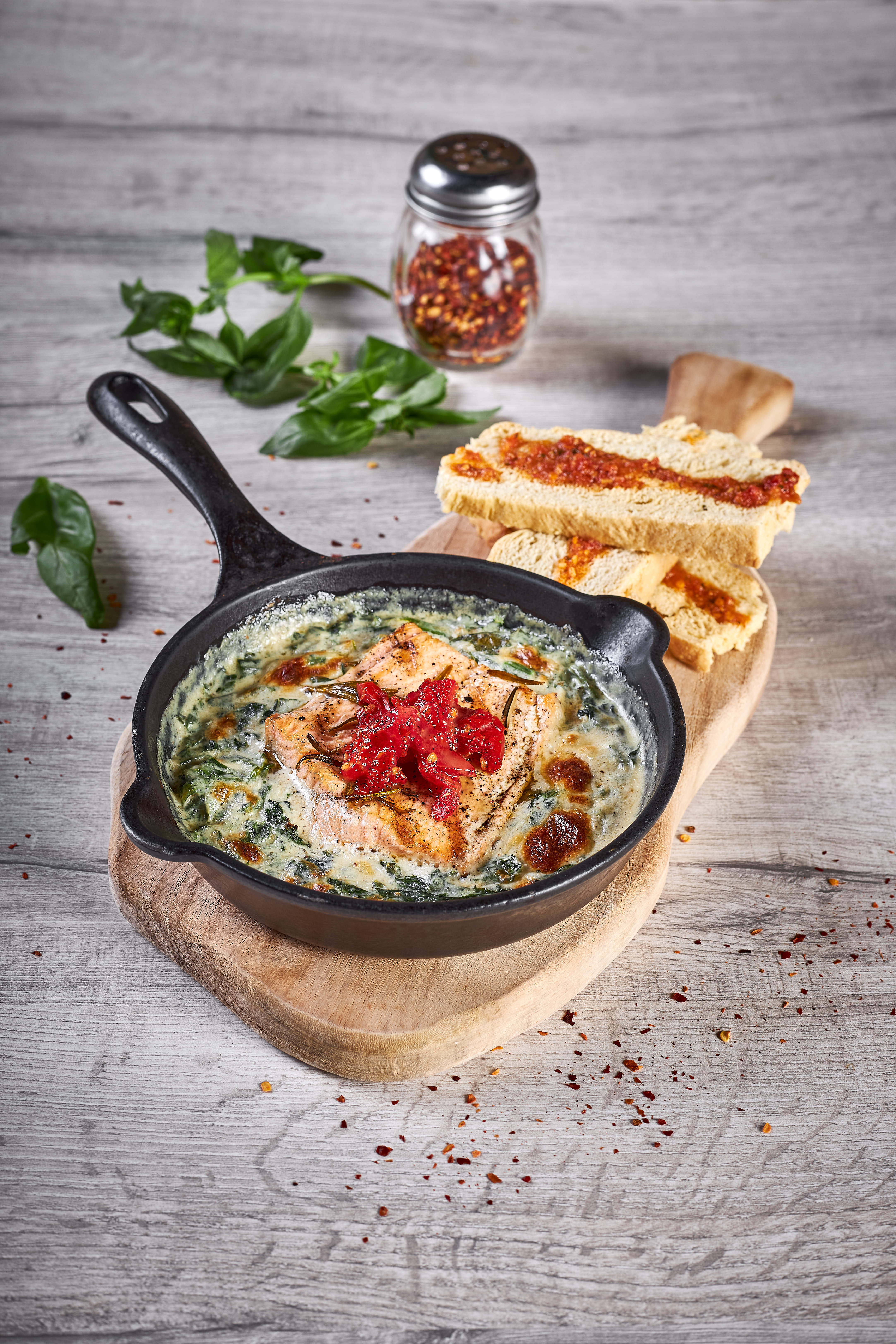Salmón sobre una cama de espinaca gratinada, tomates secos y vinagreta de naranja, acompañada de tostones de pan focaccia con pesto verde rústico.