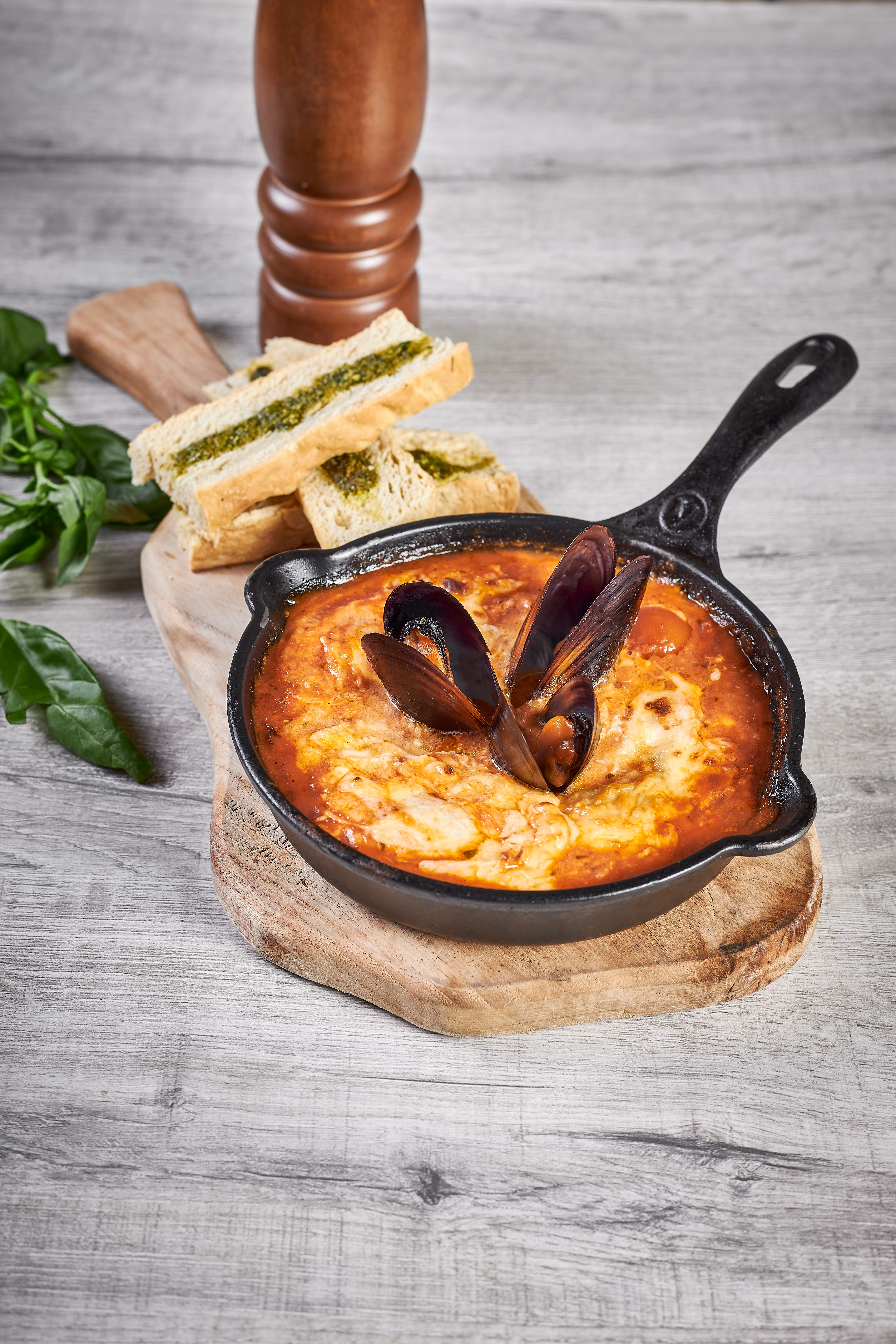 Deliciosa mezcla de camarones, mejillones, tomates cherry, queso mozzarella, y parmesano en base pomodoro, acompañada de tostones de pan focaccia con pesto rústico, gratinado y con un toque único de especia.