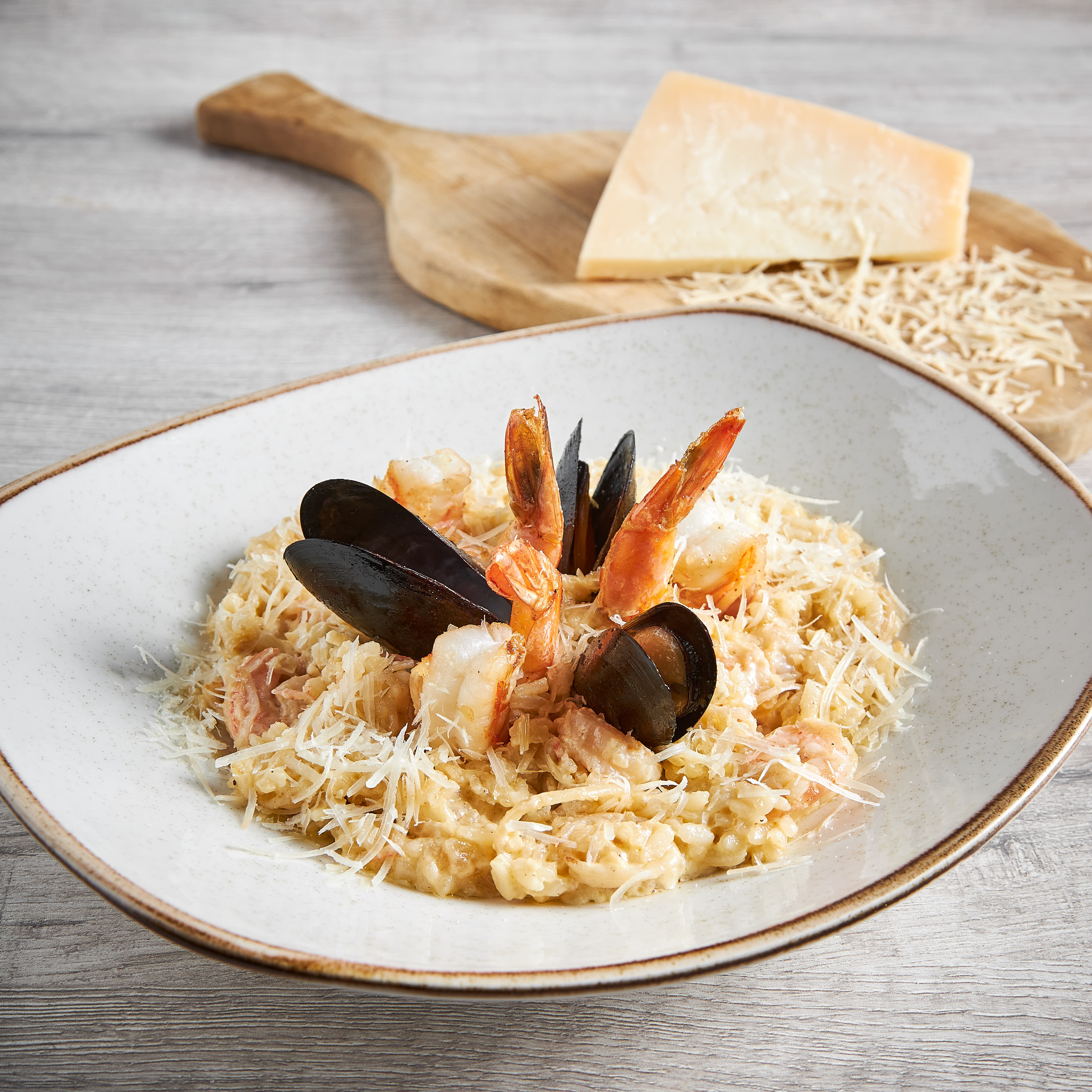 Exquisita mezcla de camarones, calamares, langostinos, palmitos de cangrejo y mejillones en nuestro cremoso risotto artesanal.