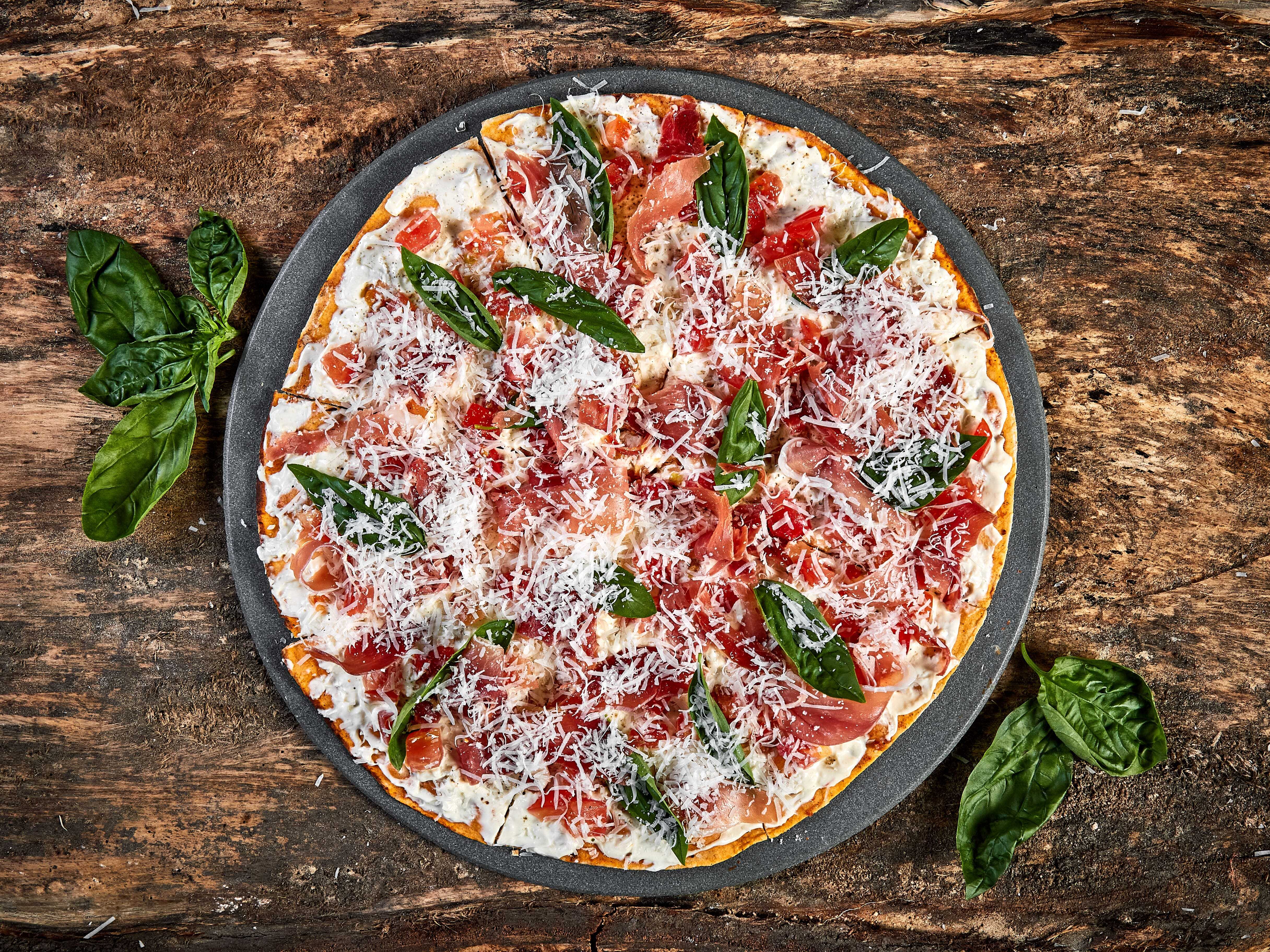 Base pomodoro, stracciatella (producto frío), albahaca, prosciutto, tomate fresco y queso parmesano.