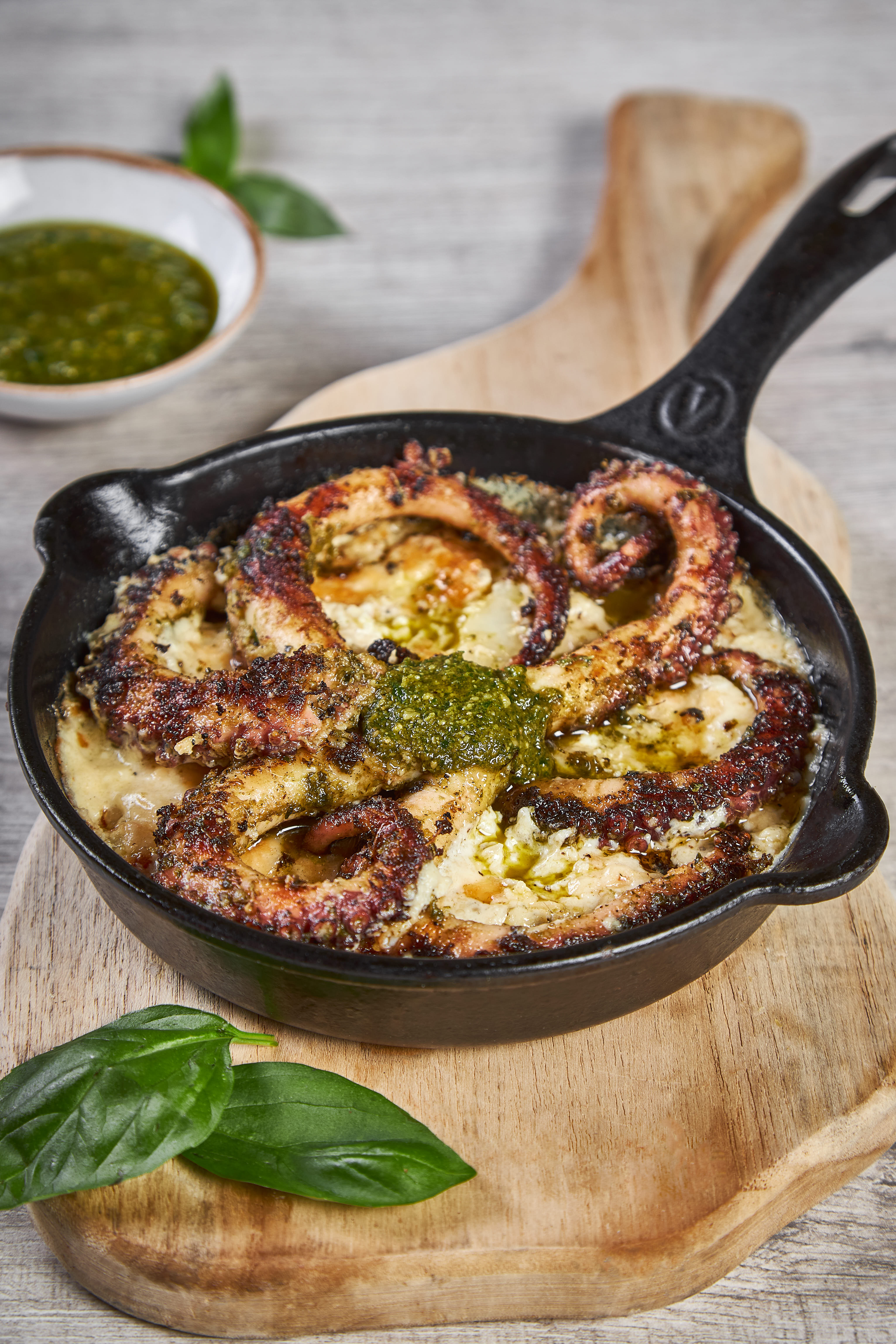 Pulpo parrillado con salsa de pesto rústico, sobre una cama cremosa de papa gratinada, acompañado de pan focaccia.