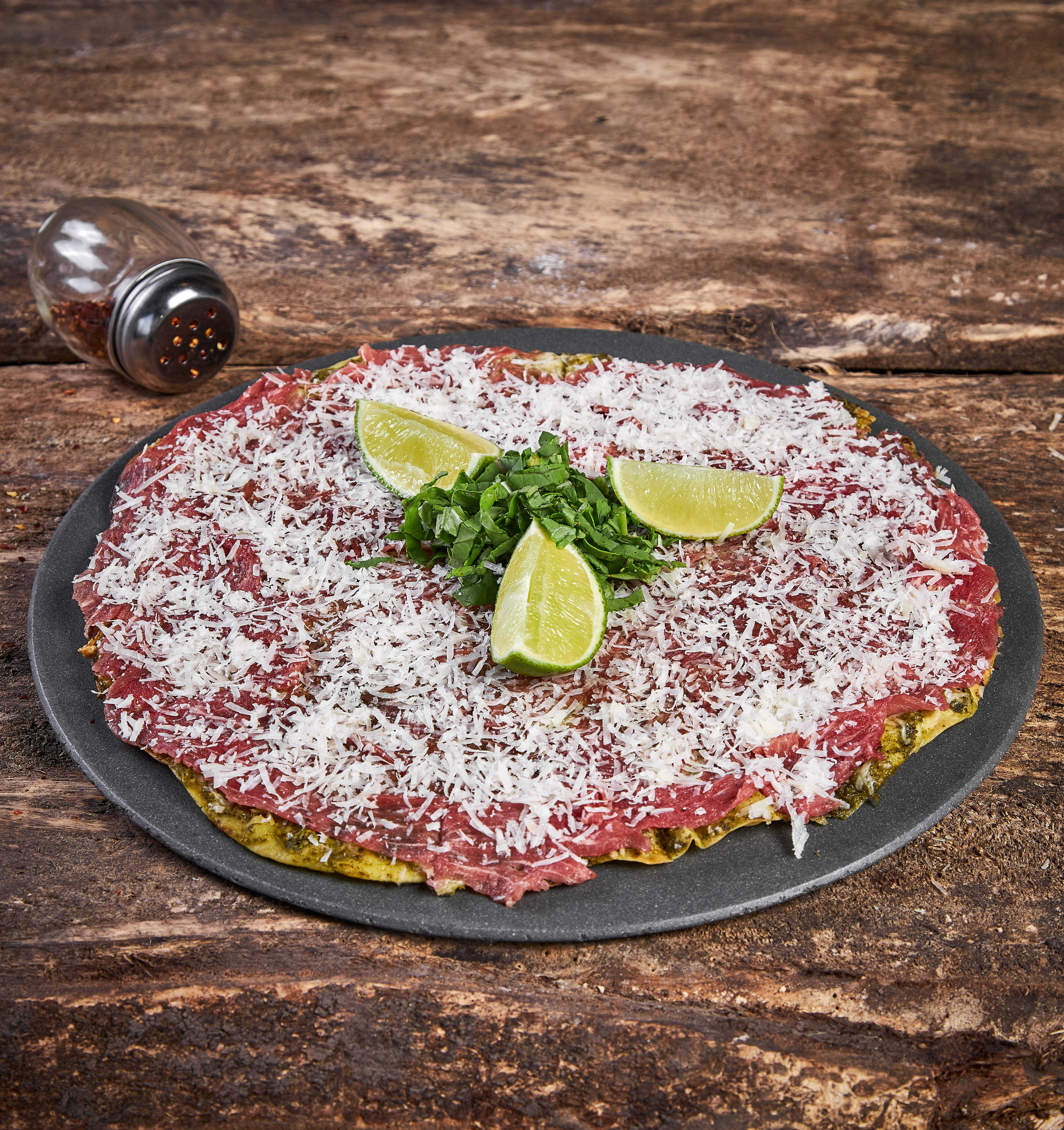 Finas lonjas de carpaccio de res sobre pesto de albahaca, mostaza dijon, champiñones y parmesano acompañado de mezclum fresco, flores en vinagreta de frutos secos. producto frío**.