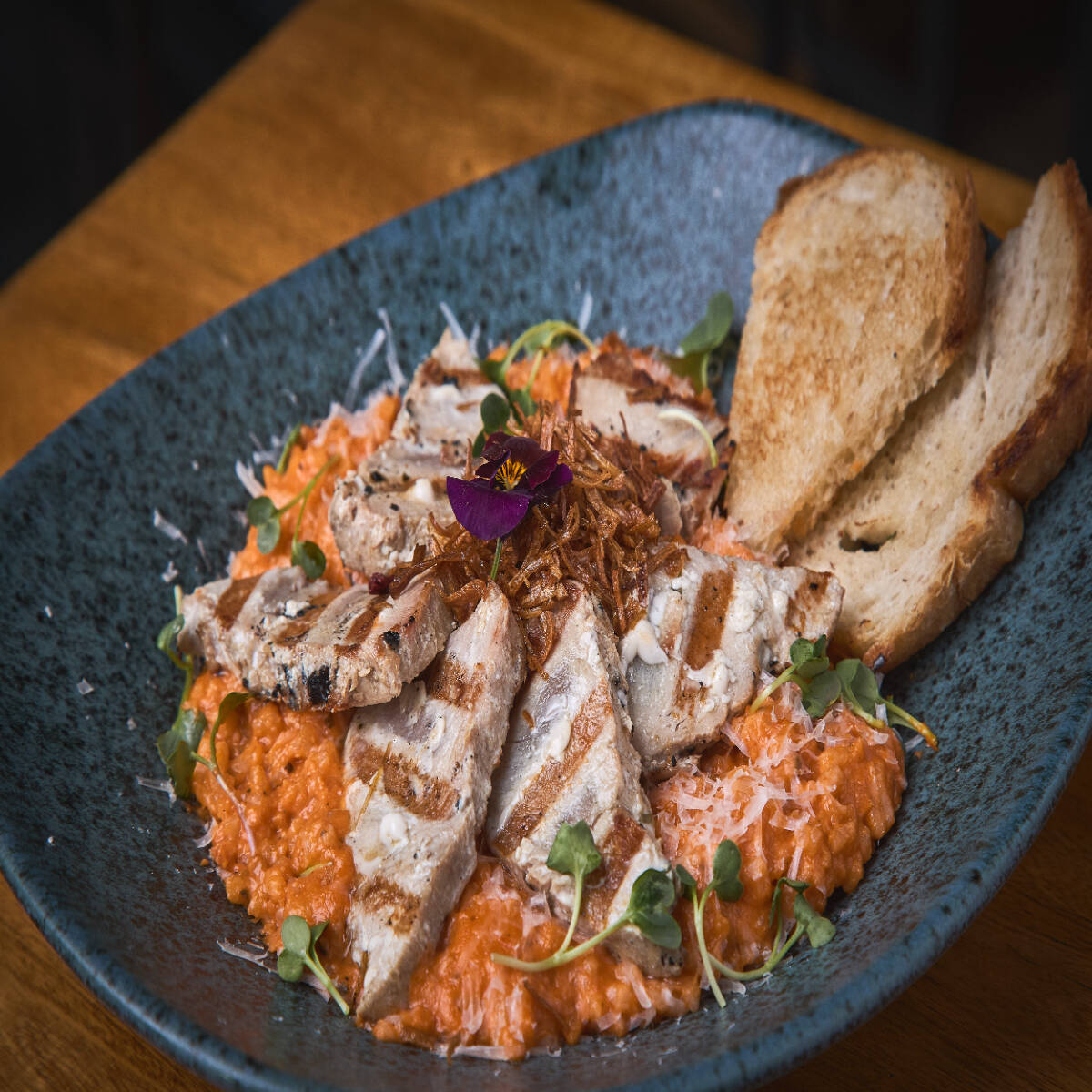 Risotto con nuestra artesanal salsa pomodoro hecha en casa, coronado con atún fresco sellado al momento, brotes verdes y cipolla crocante. Acompañado de pan de masa madre al grill.