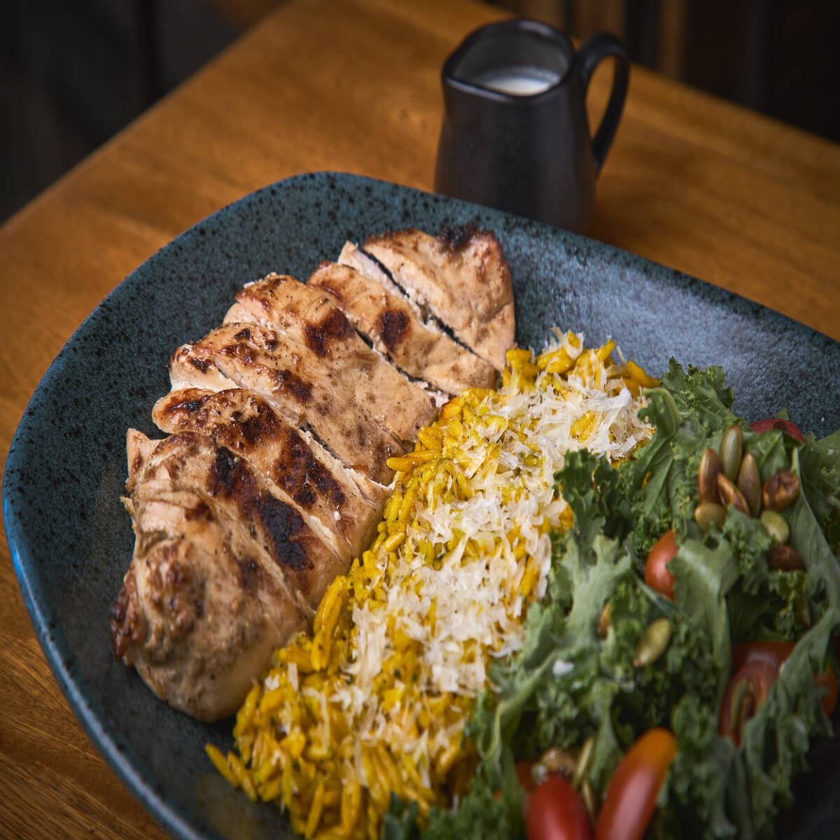 Orzo infusionado con cúrcuma, servido con fresca mezcla de kale, lechugas, tomates y semillas de calabaza, crocante finalizado con salsa Tzatziki. Elige tu proteína favorita.