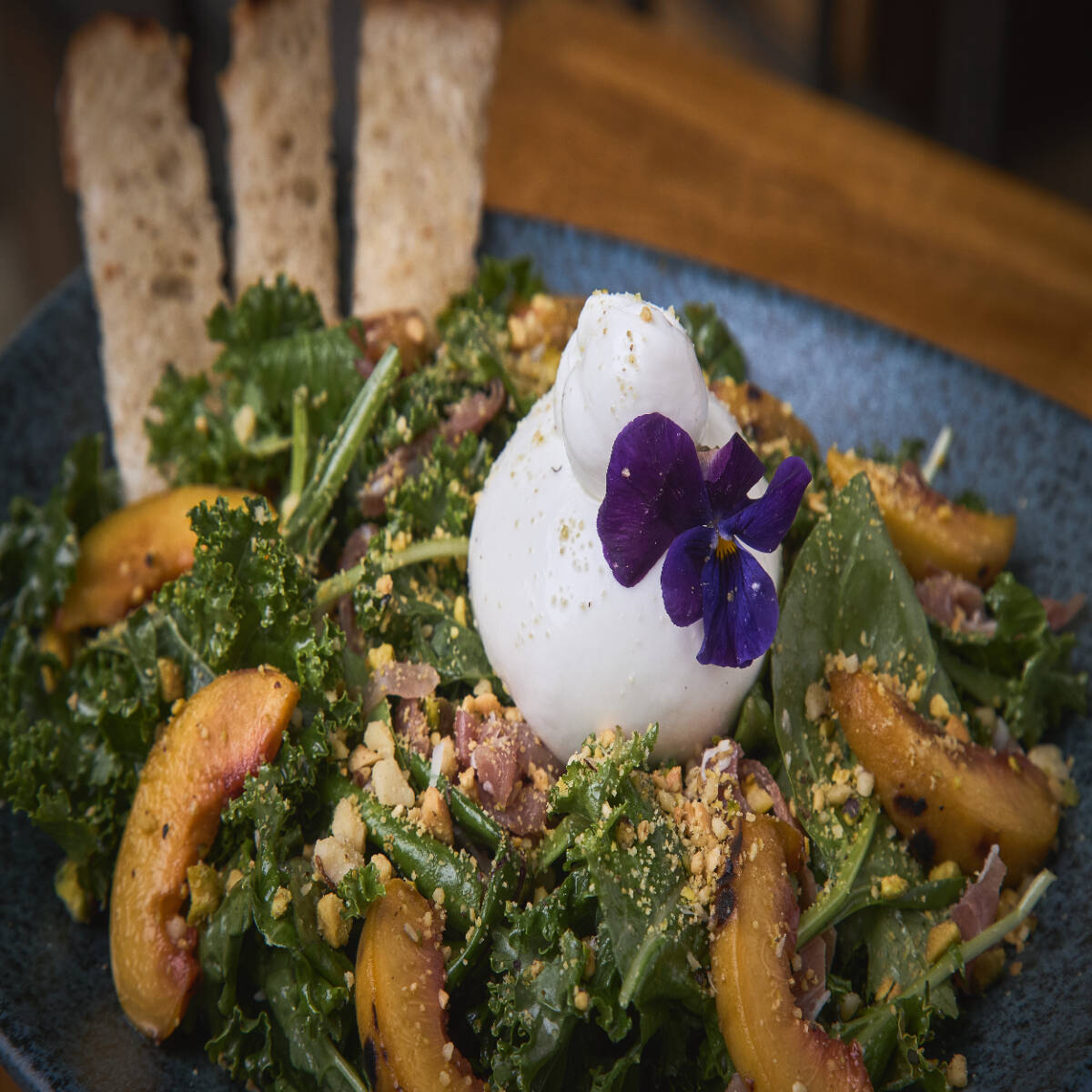 Burrata fresca servida en una cama de mezcla kale y lechugas frescas con vinagreta de frutos secos. Acompañada de prosciutto, dulces duraznos parrillados y mix de frutos secos, finalizada con bastones de pan de masa madre al grill.