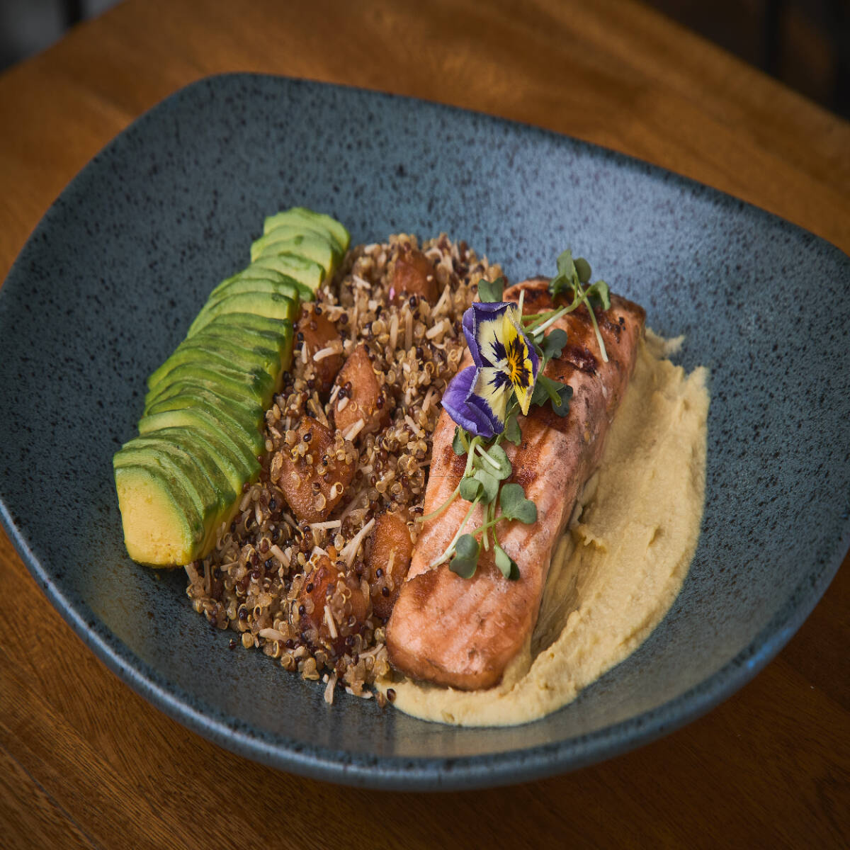 Hummus artesanal con finas hierbas, acompañado de una mezcla de batata confitada, quinoa tricolor y queso parmesano; acompañado de laminas de aguacate. Elige tu proteína favorita.