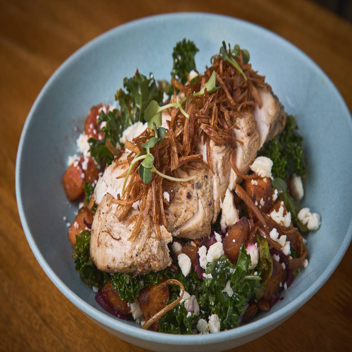 Ensalada con base de mezcla de kale fresco y mix de lechugas, con queso feta, cebolla osmotizada en remolacha, batata confitada y vinagreta de frutos secos. Acompañada de nuestro jugoso Pollo Romero y finalizada con cipolla corcante.