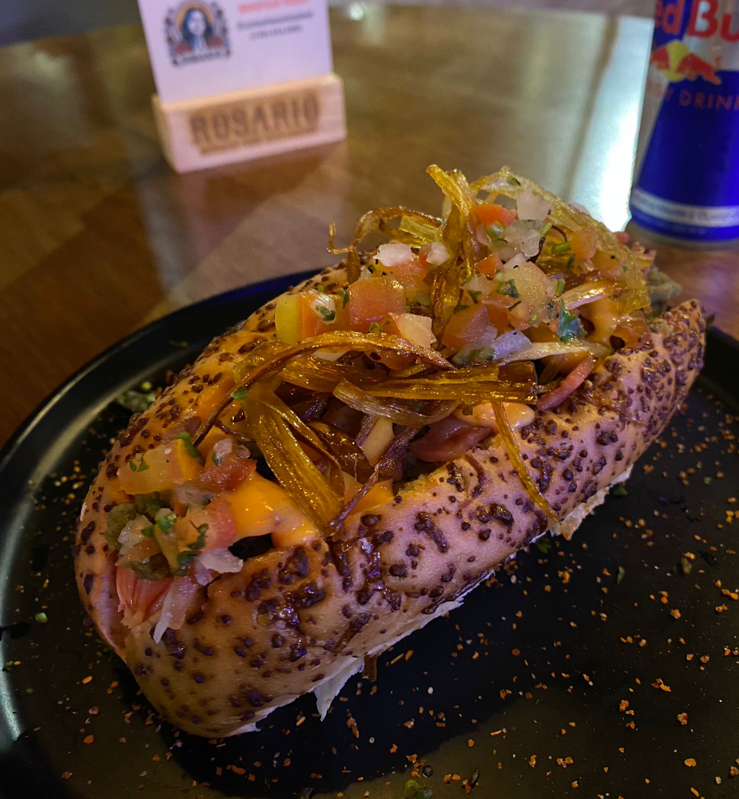 Salchicha premium, tocineta crocante, queso cheddar, salsa verde tatemada, puerro crocante, pico de gallo y porción de papas de la casa.