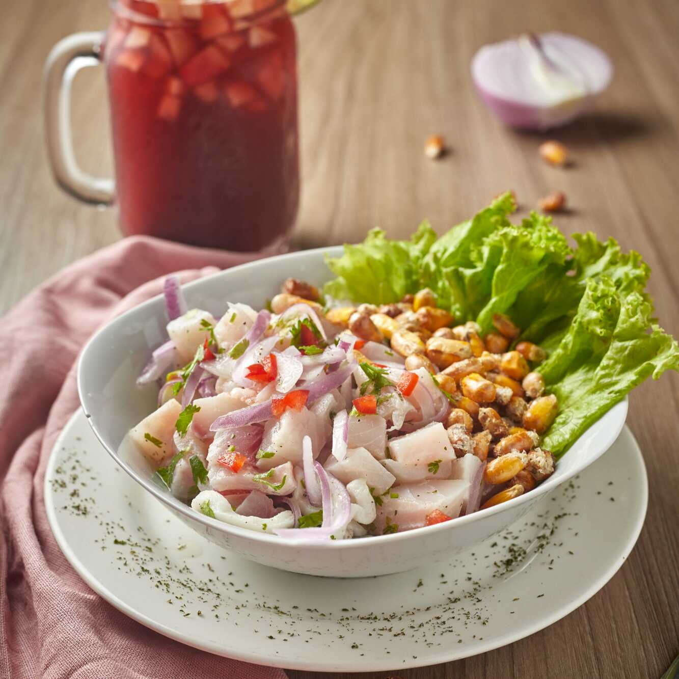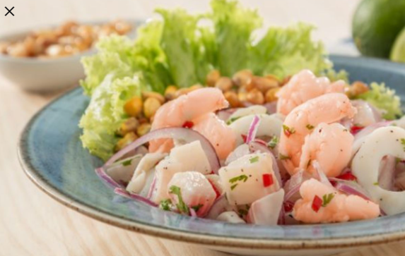 Pescado, calamar y camarón marinados en jugo de limón, cebolla y especias.