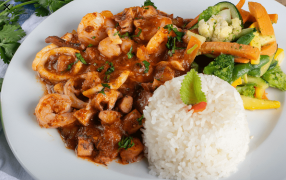 Filete de pescado cubierto con mariscos en salsa de ají panca y vino blanco, acompañado de arroz y verduras salteadas.