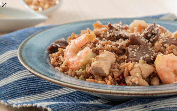 Fusión peruana-oriental con pollo, cerdo, carne, salsa de soya, vegetales, trocitos de tortilla y un toque de ajonjolí.