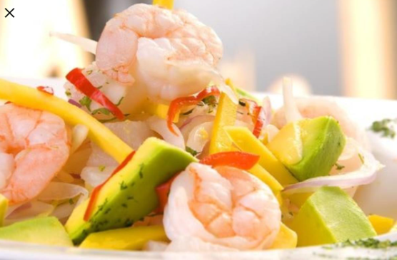 Pescado, camarón, mango y aguacate, marinados en jugo de limón, cebolla y especias.