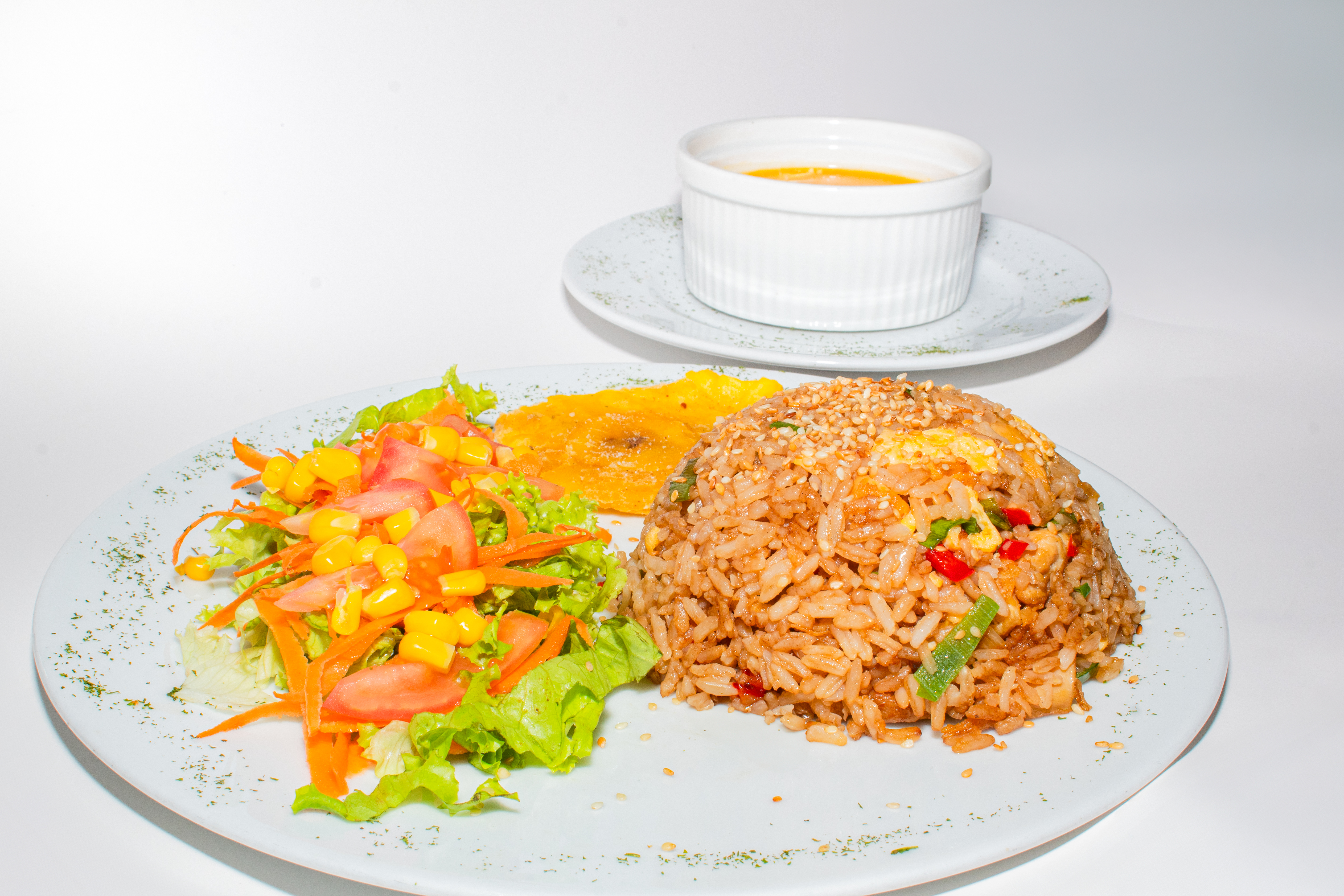 Fusión peruano - oriental con vegetales, salsa de soya, vegetales (zanahoria, tomate, cebolla). trocitos de tortilla y un toque de ajonjolí.