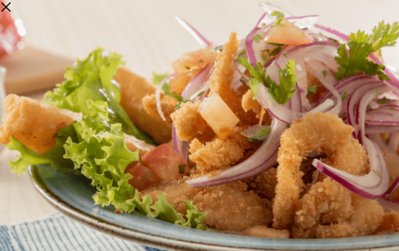 Crocantes cubos de pescado, aros de calamar y camarones servidos en salsa criolla.