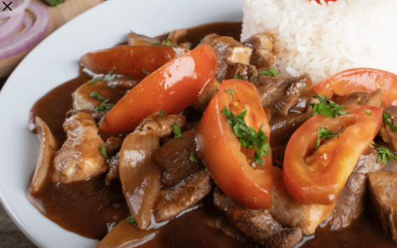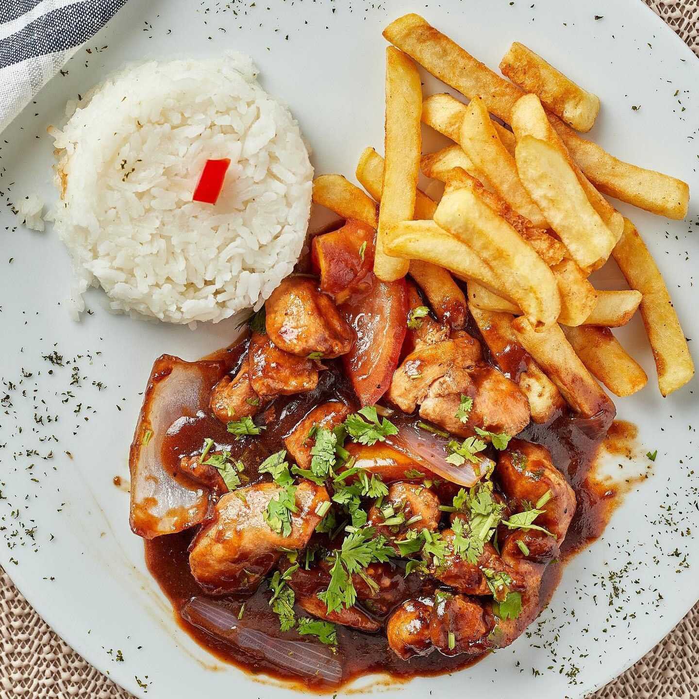 Juliana de lomo fino cerdo y pollo al w ok con tomate, cebolla y papas fritas, acompañadas con arroz blanco