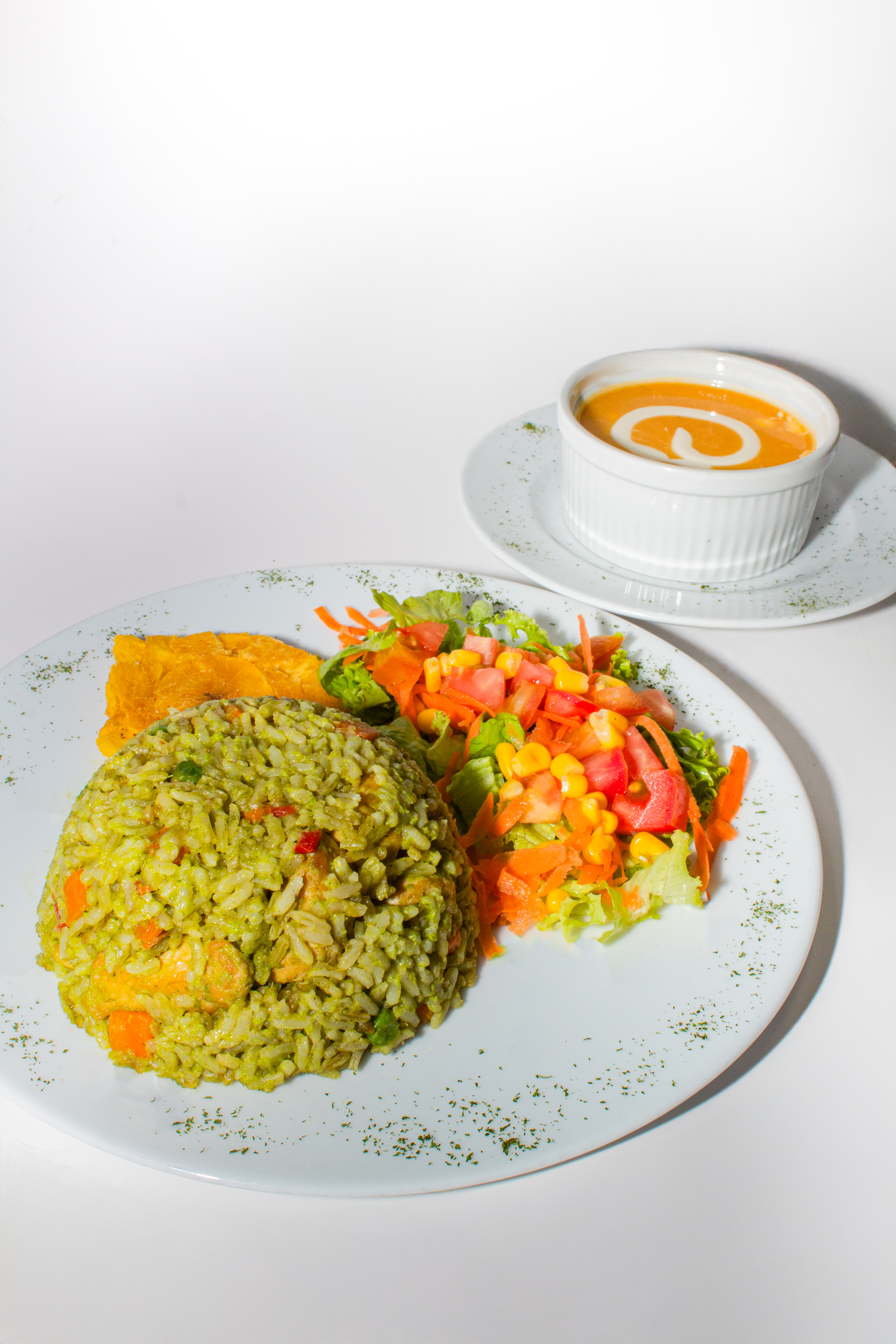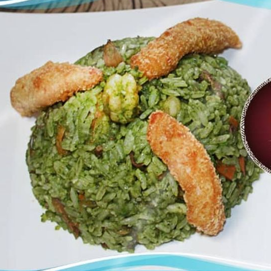 Arroz en suave crema de cilandro, con trozos de pollo y verduras.