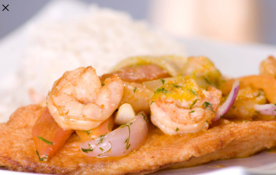 Filete de pescado cubierto con camarones salteados con tomate y cebolla, acompañado con arroz y verduras salteadas.