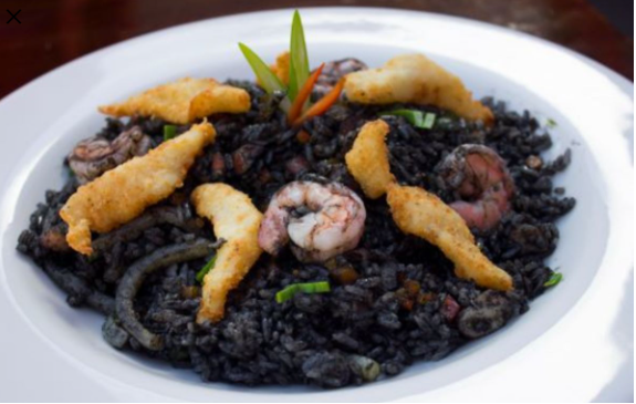 Pescado, calamar y camarón en arroz pintada con una tinta oscura de calamar con verduras y especias peruanas.