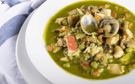 Pescado, calamar y camarón en arroz con pasta de cilantro, con verduras y especias peruanas