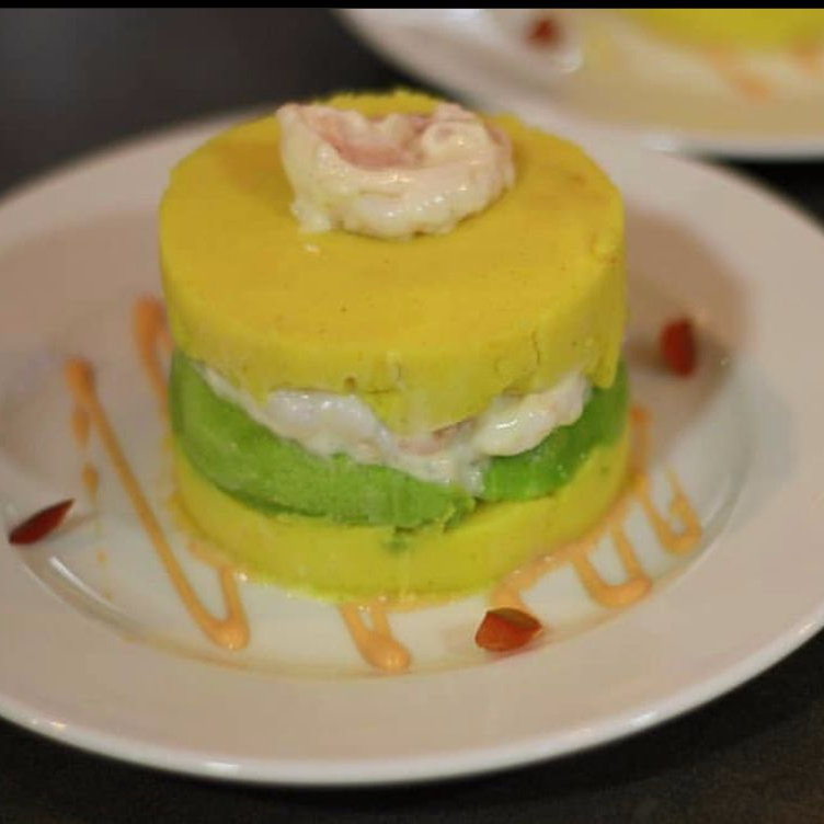 Base de puré de papa, limón, ají amarillo y aguacate rellena de camarones.