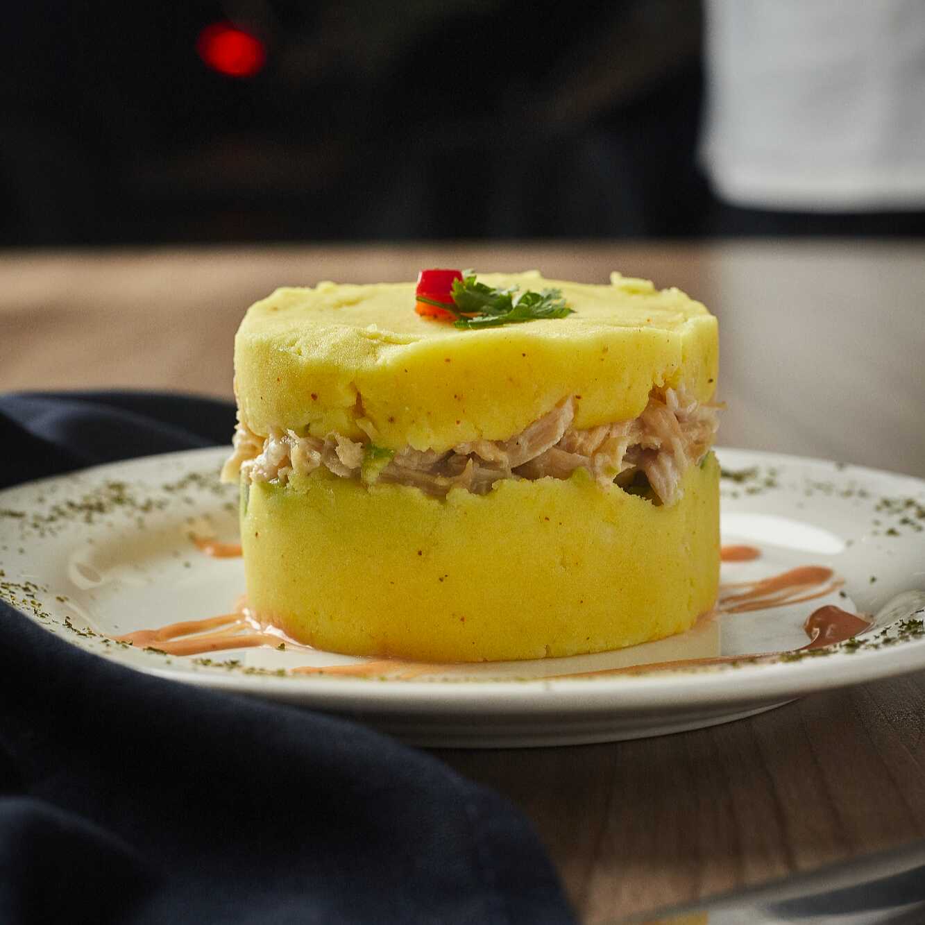 Base de puré de papa, limón, ají amarillo y aguacate relleno de pollo.