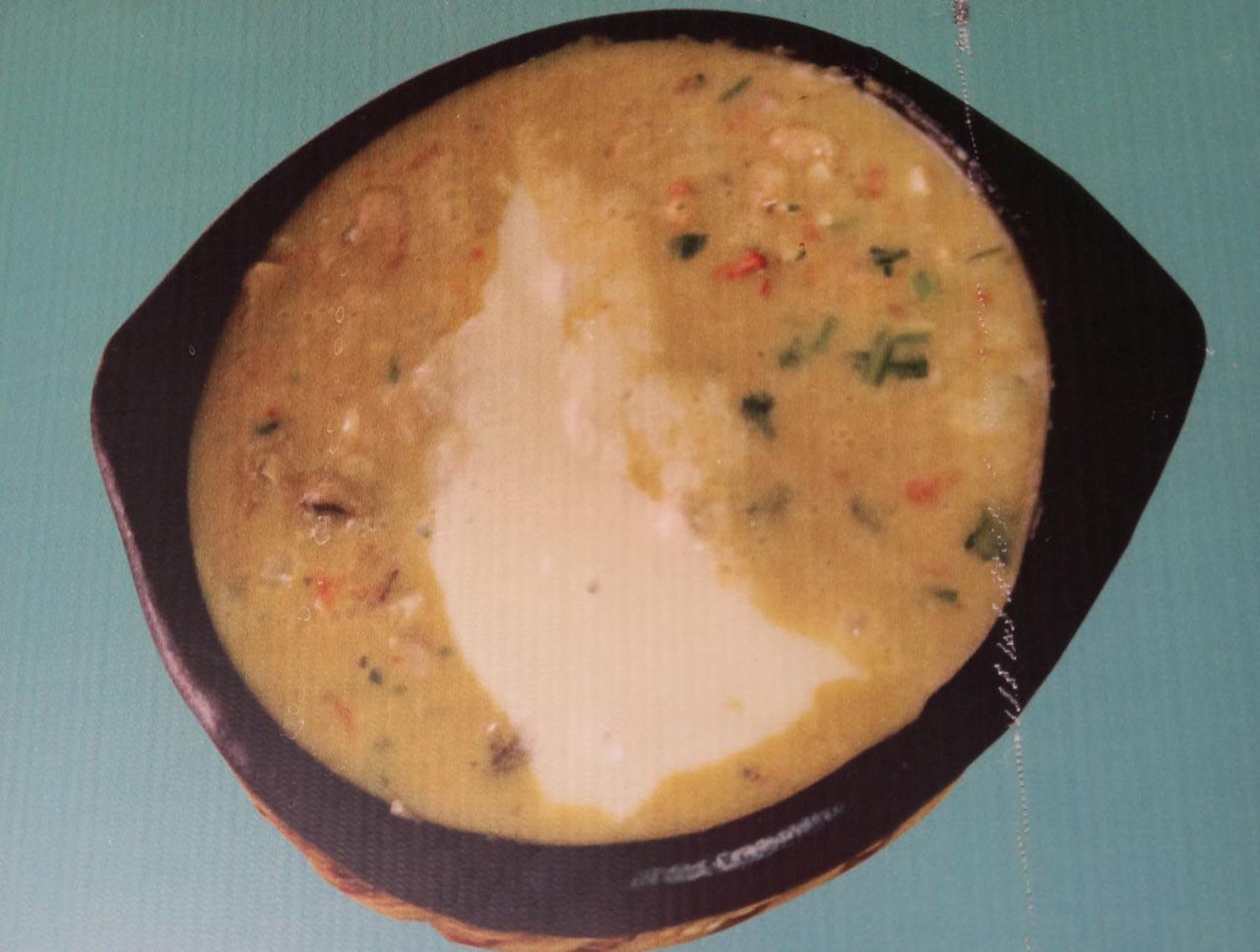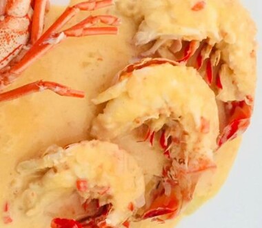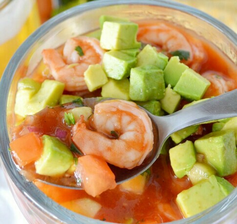 Bañada en salsa de camarón, acompañada de arroz con coco o blanco, ensalada, patacón, consomé y guarapo.