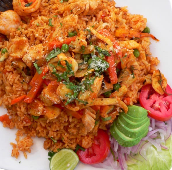 Arroz con mariscos, acompañado de patacón o papa a la francesa, consomé y guarapo.