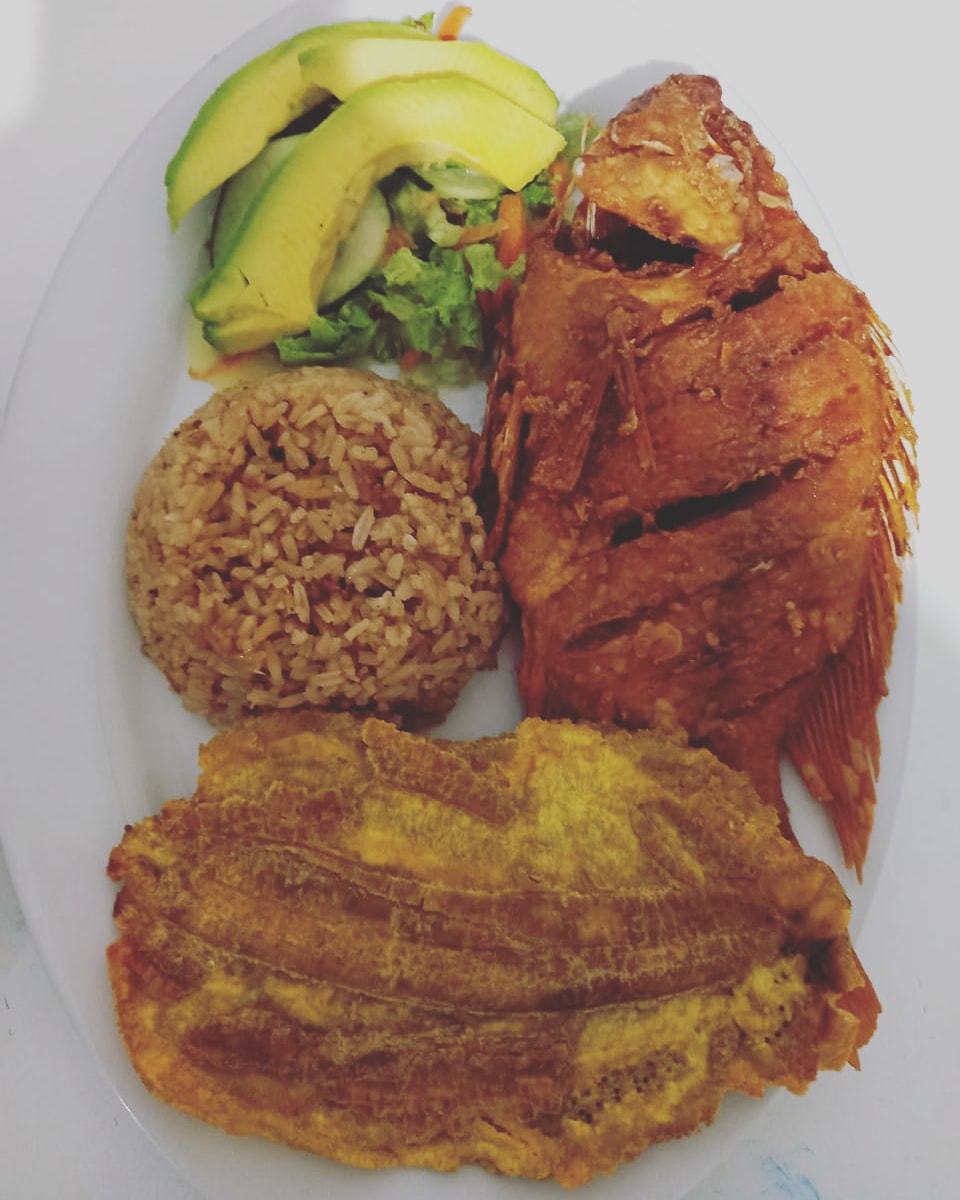 Acompañado de arroz de coco o blanco, patacón, ensalada, consomé y guarapo.