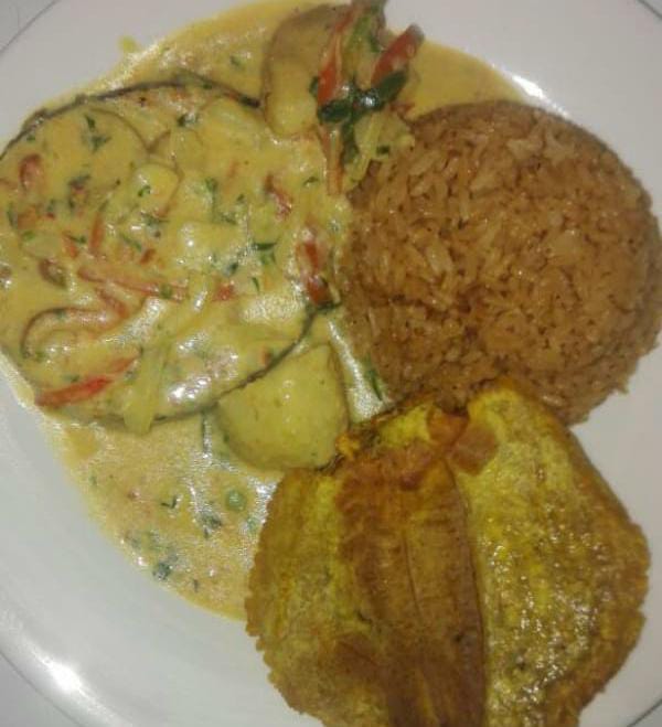 Bocachico sudado en leche de coco, acompañado de arroz con coco o blanco, patacón, consomé, ensalada y guarapo.