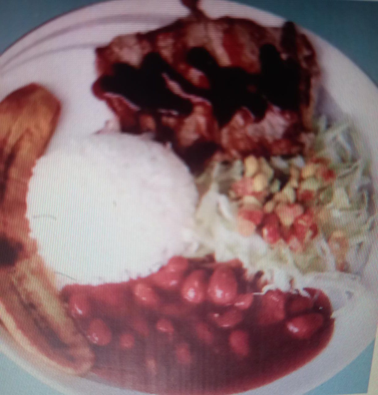 Arroz, tajada, huevo, frijoles, chicharrón, chorizo, carne de res, arepa, sopa del día y guarapo.