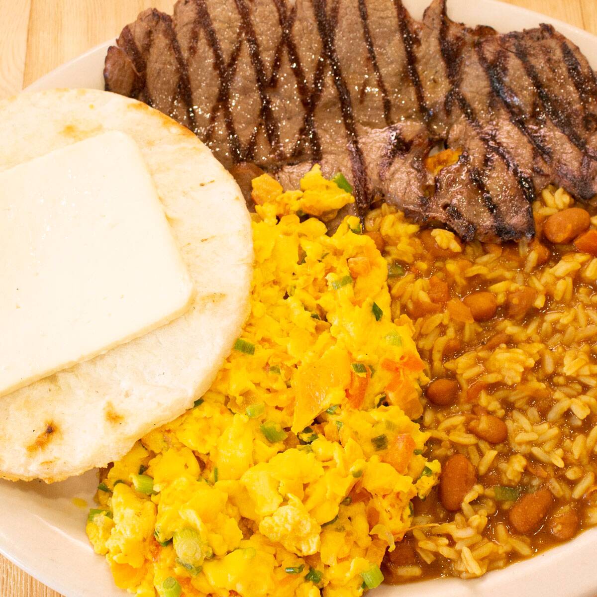 Calentado de arroz con frijol, arepa con queso mozzarella, huevos, proteínas elegir y bebida a elección.