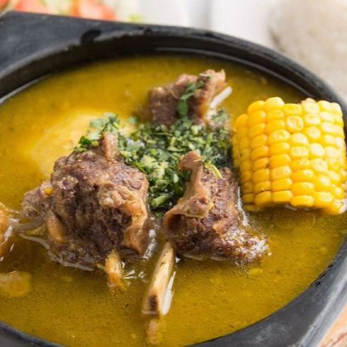 Sancocho de carne de morrillo de res, arroz, ensalada, aguacate o banano, limón, arepa y jugo del día.